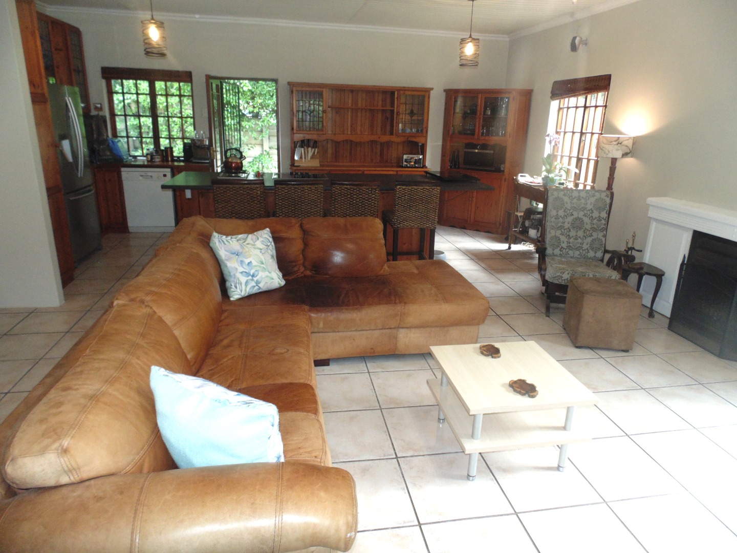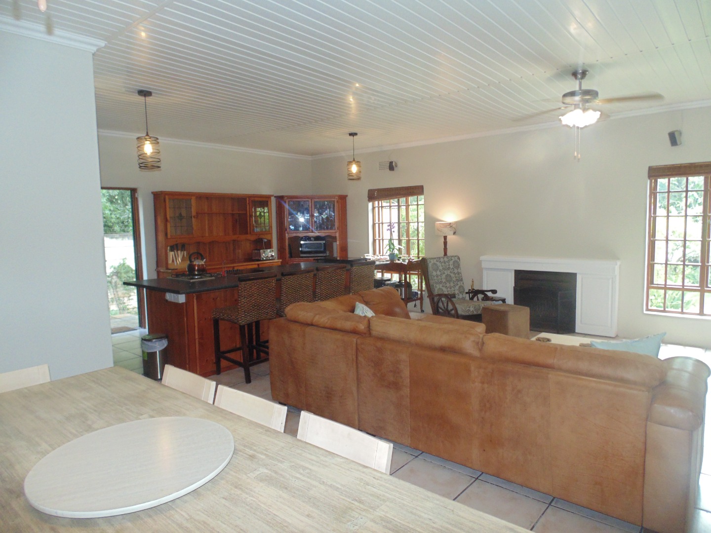 The living areas are bright and welcoming, with large windows allowing ample natural light. A cozy fireplace adds warmth and ambiance, while the stylish paneled ceilings contribute to the home's character. Step outside to discover a private outdoor oasis, ideal for relaxation and entertainment. The property features a large, clean swimming pool, a charming thatched lapa, and a lush, established garden. A tiled patio provides ample space for outdoor dining, making it perfect for enjoying the South African climate.
