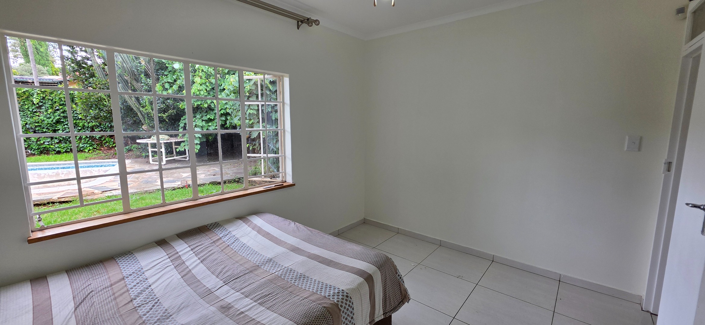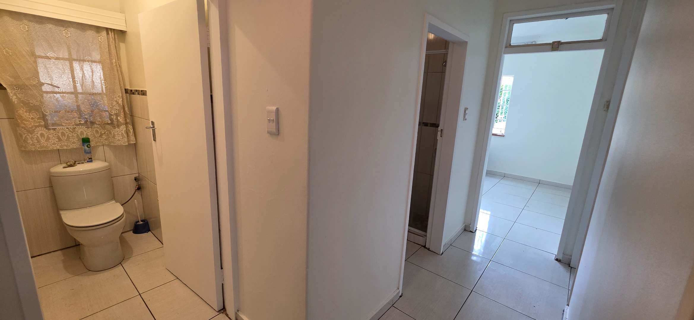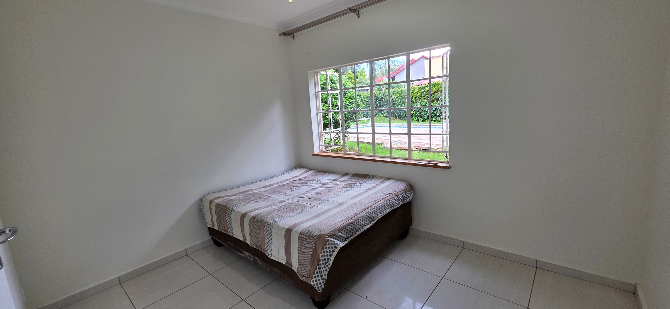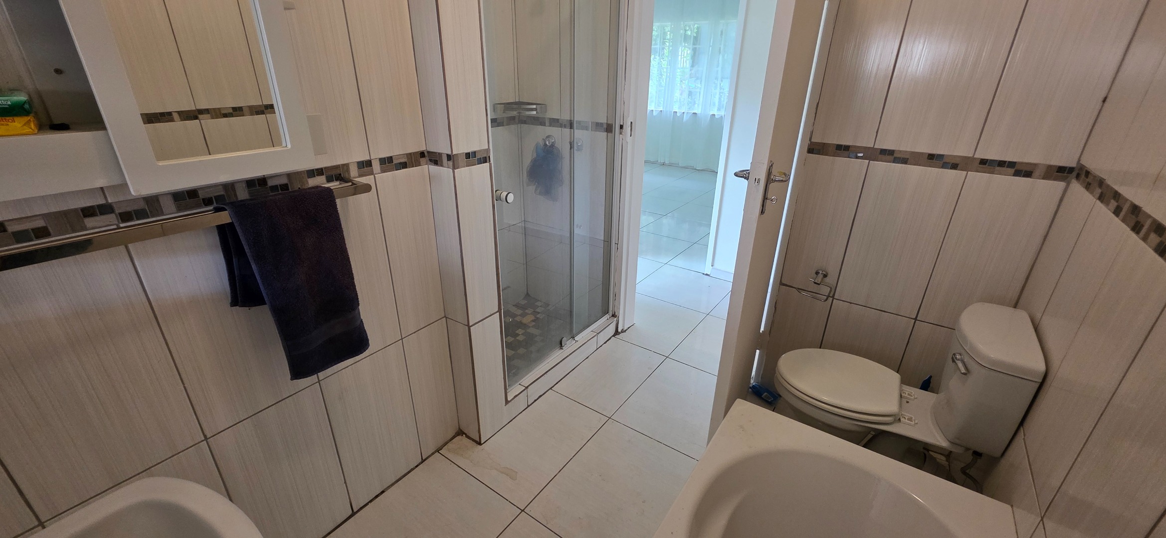 The main house offers three well-sized bedrooms, all fully tiled, fitted with built-in cupboards, and light and airy with garden-facing windows. These bedrooms are serviced by one and a half bathrooms, consisting of a full bathroom with bath, shower, basin, and toilet, as well as a separate guest toilet. The bathrooms are neat, functional, and well maintained.