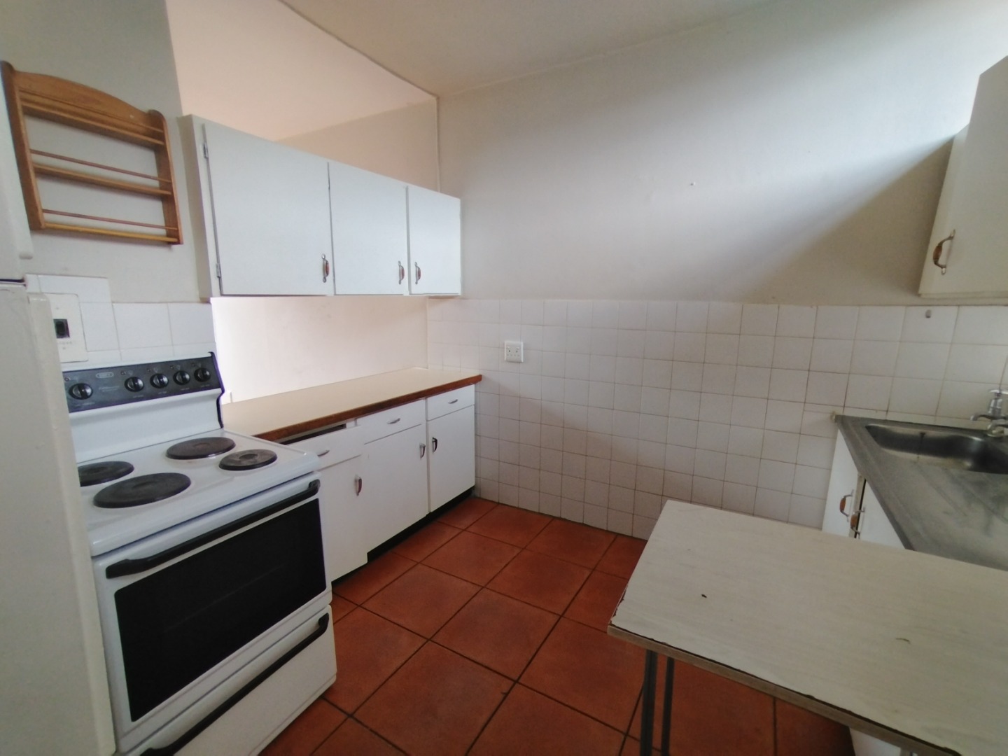 The kitchen has enough cupboard space, and a wide serving hatch to the open plan lounge / dining room.