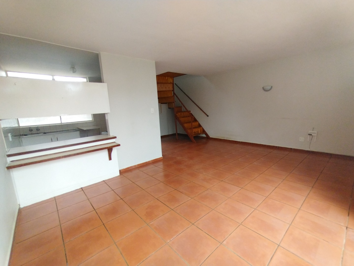 The kitchen has enough cupboard space, and a wide serving hatch to the open plan lounge / dining room.