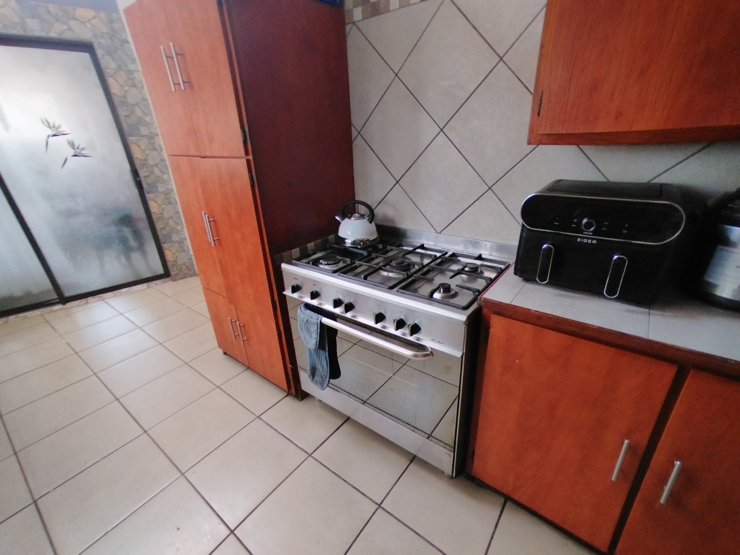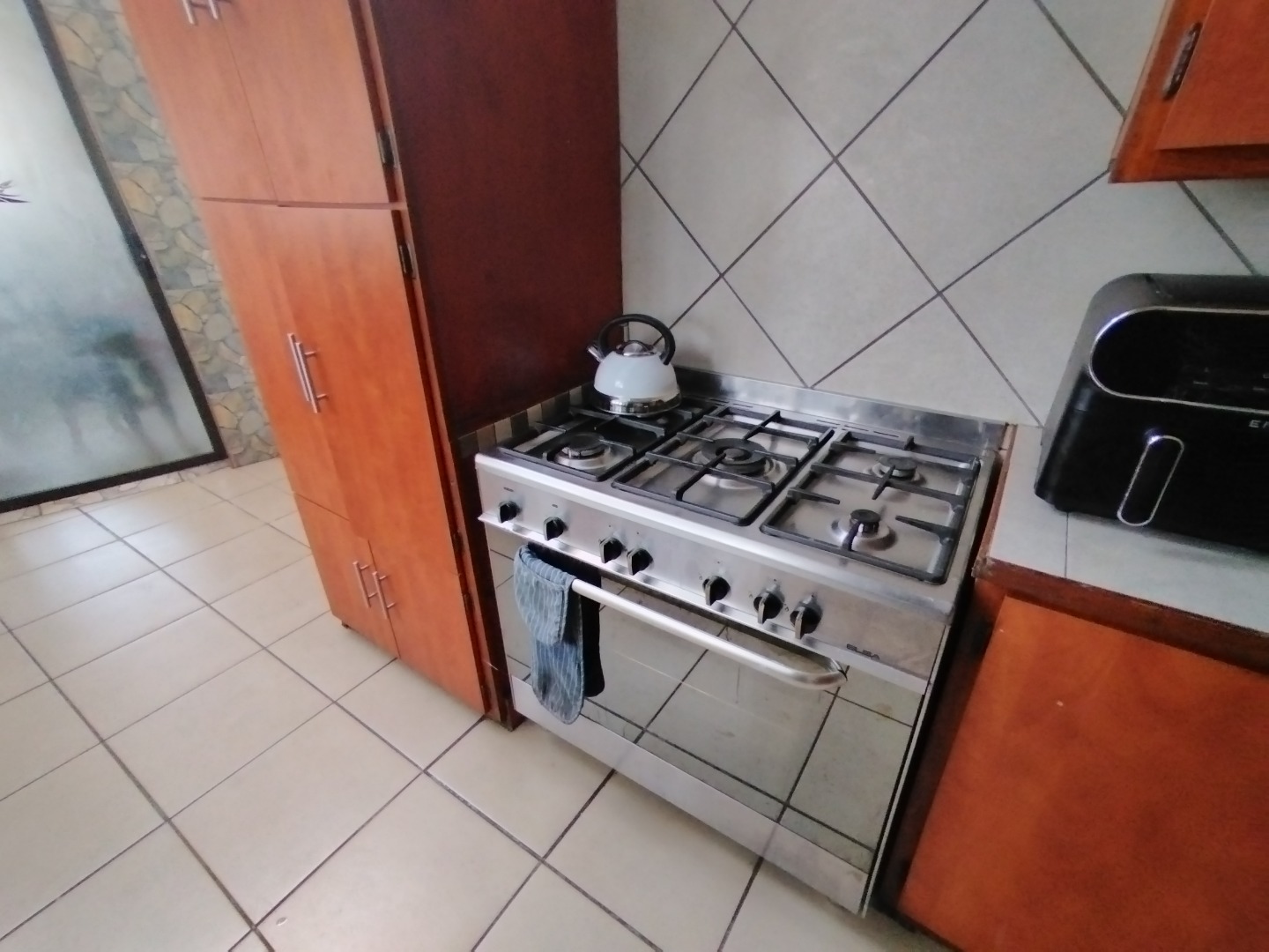 - Modern kitchen with ample cupboard and counter space, full gas stove