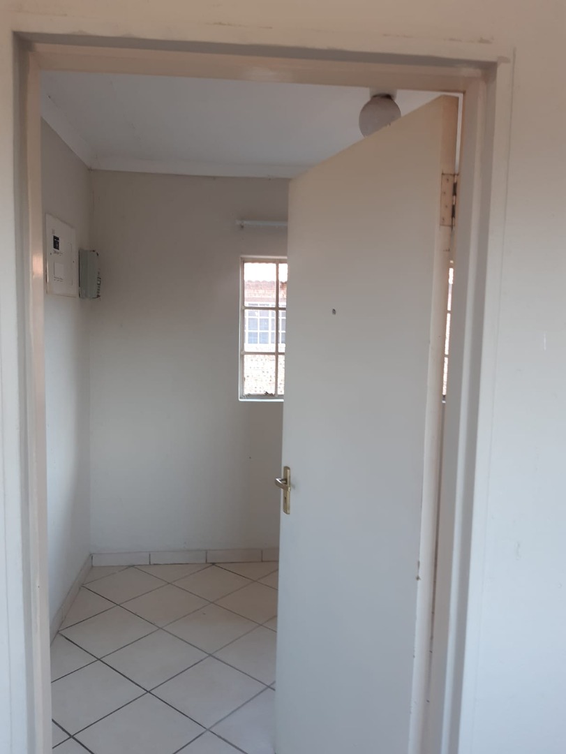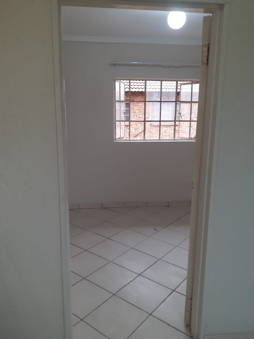 Situated within a complex, the property prioritises security. The exterior is secured by a high brick wall topped with electric fencing, offering peace of mind. Further enhancing safety, windows are fitted with security bars. The complex provides one dedicated parking bay, adding to the convenience for residents. While the exterior has a sturdy, utilitarian appearance, the focus is on practical, secure living.