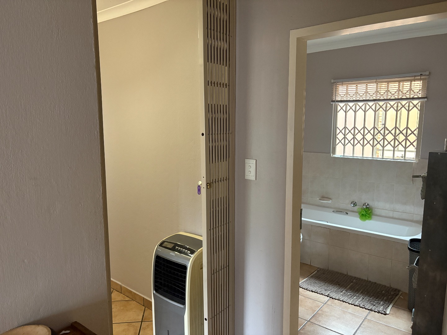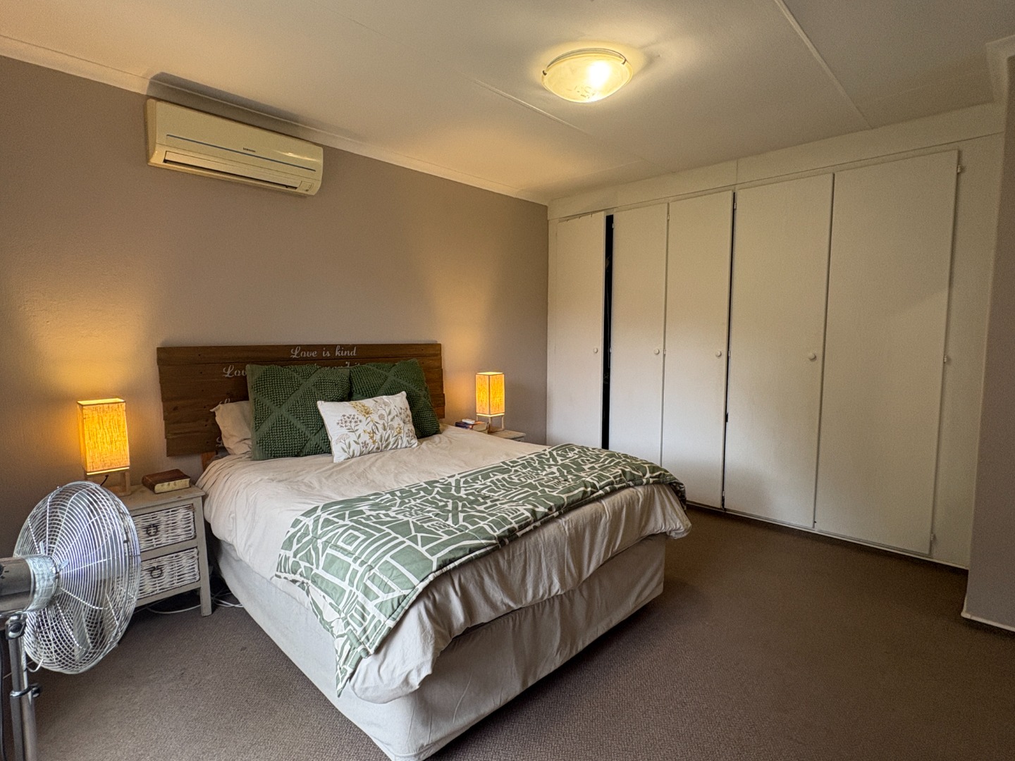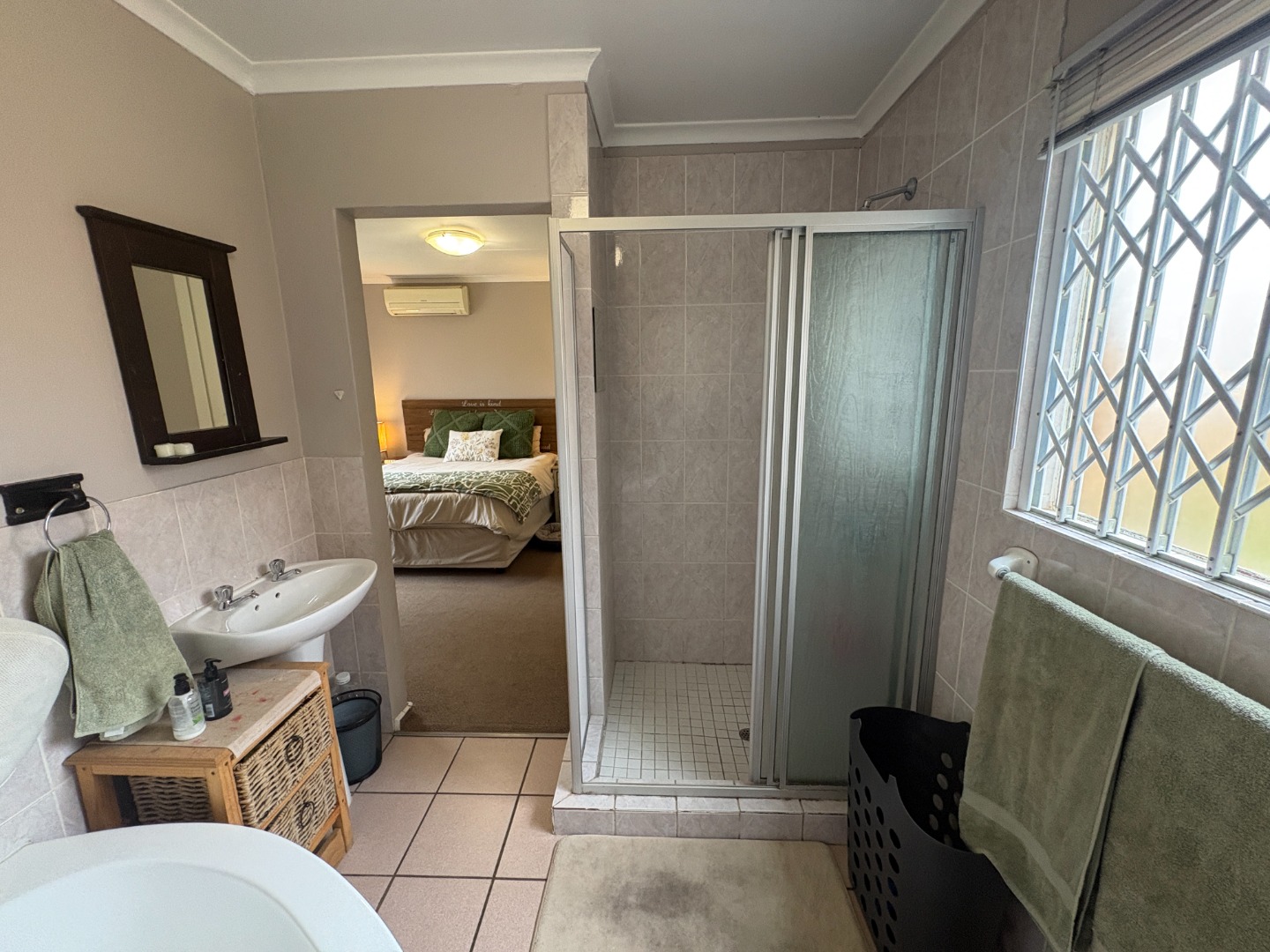 The home offers three well-sized bedrooms, with the flexibility to use one as a study or home office. The main bedroom includes an air conditioner and a full en-suite bathroom fitted with a bath, shower, basin, and toilet. The remaining two bedrooms share an optimally positioned bathroom complete with a bath, basin, and toilet.
