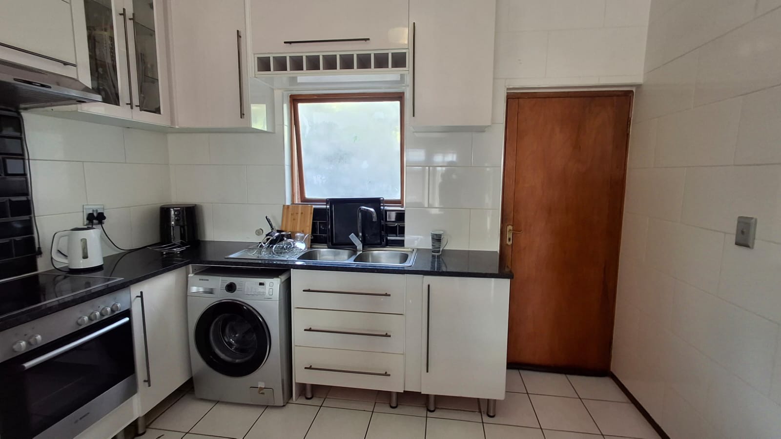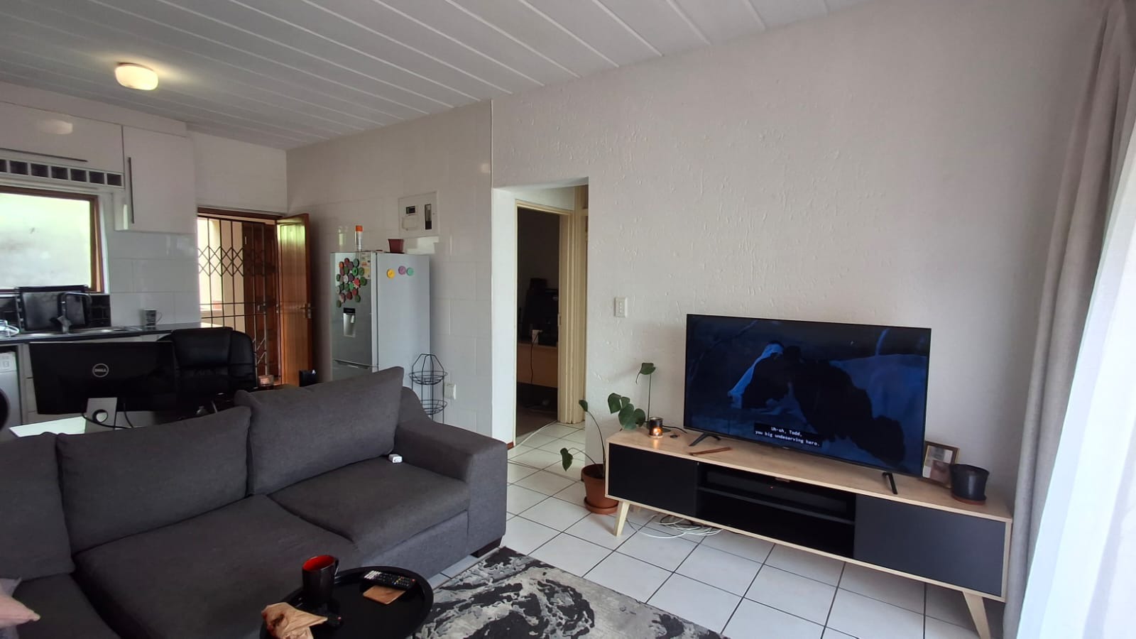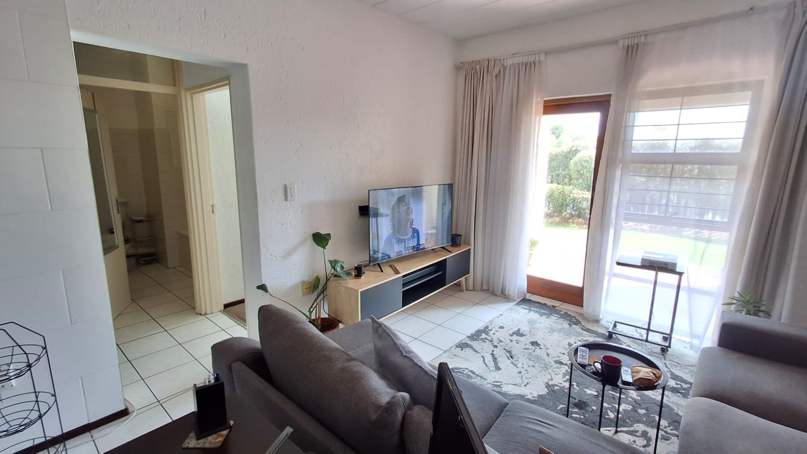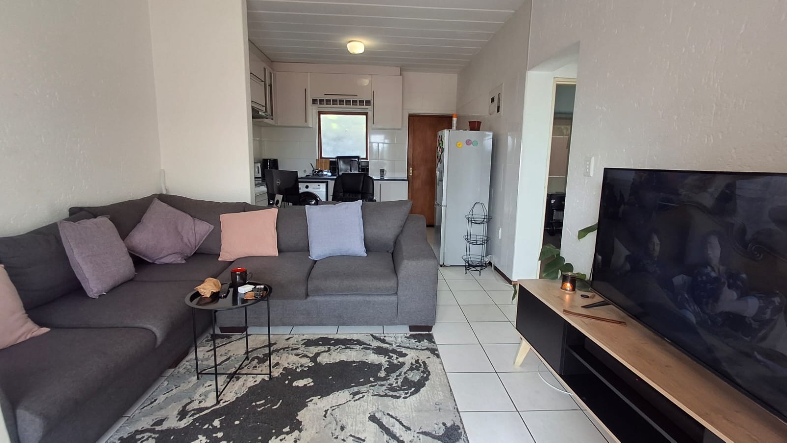 The apartment is accessed directly through the kitchen entrance, which is well-fitted with ample cupboard space and designed for easy, everyday living. From the kitchen, the layout flows into a spacious lounge area that opens onto a ground-floor patio, creating a relaxed space to enjoy fresh air or entertain guests.