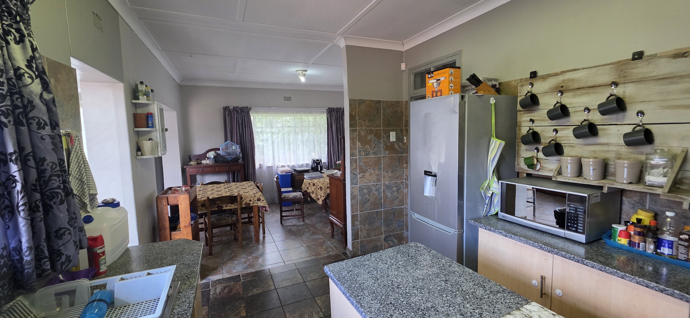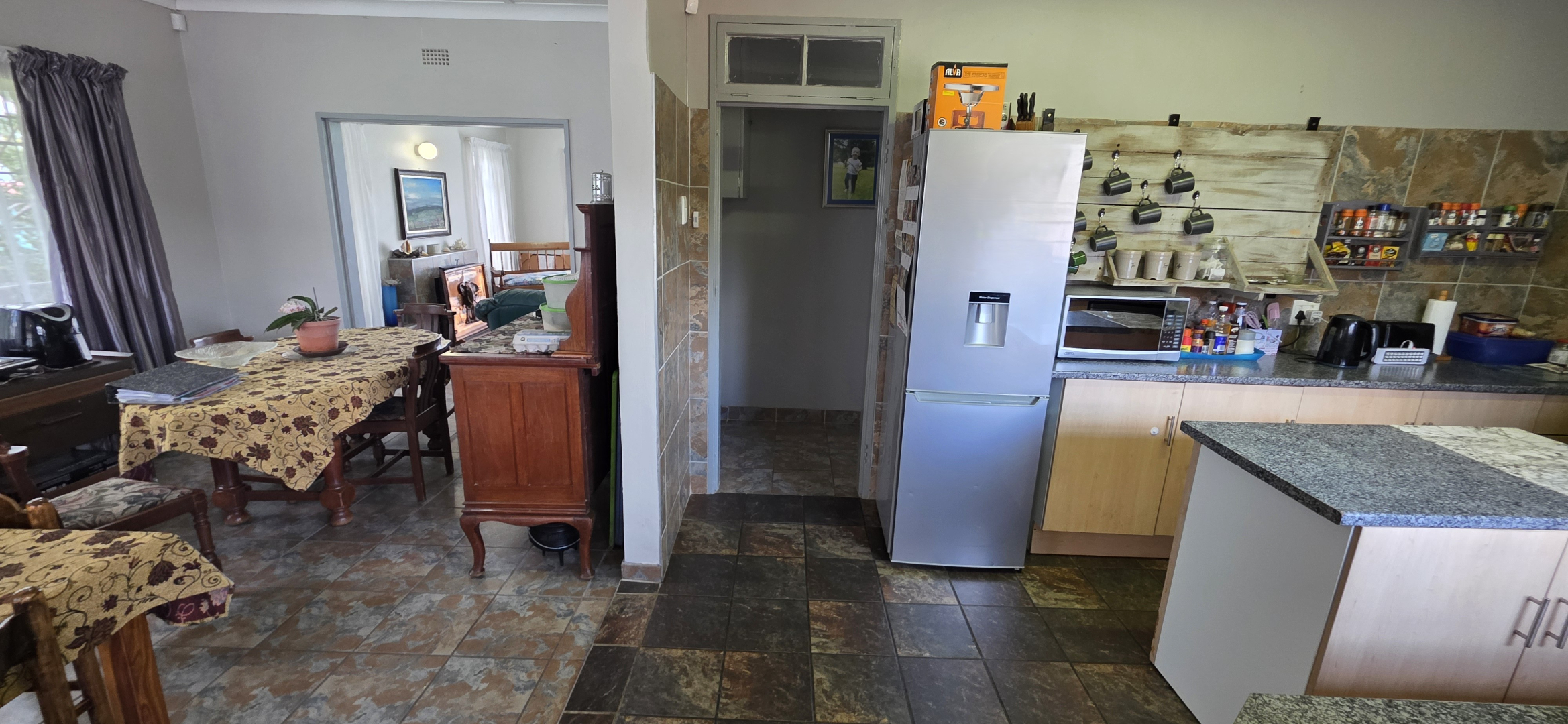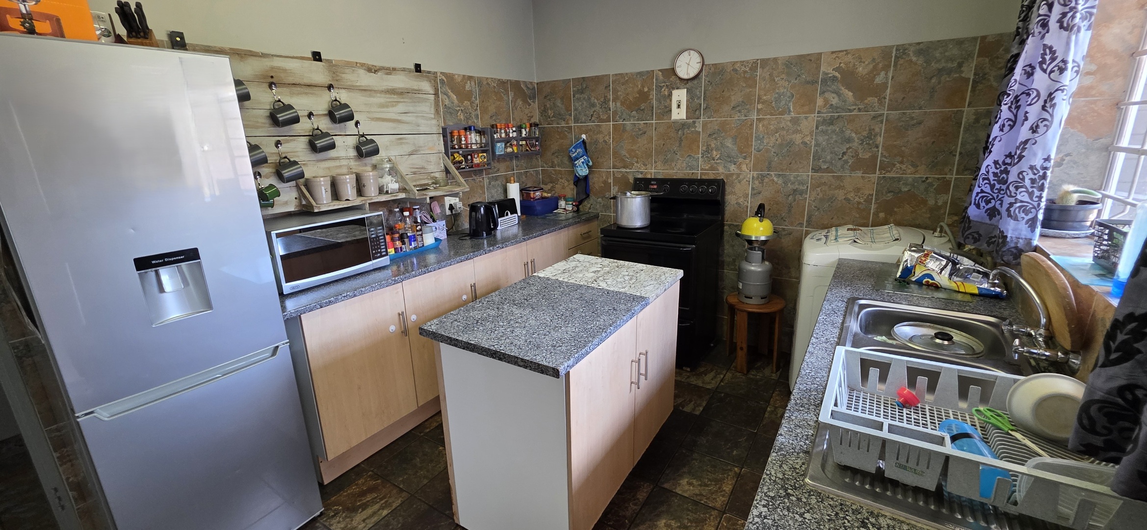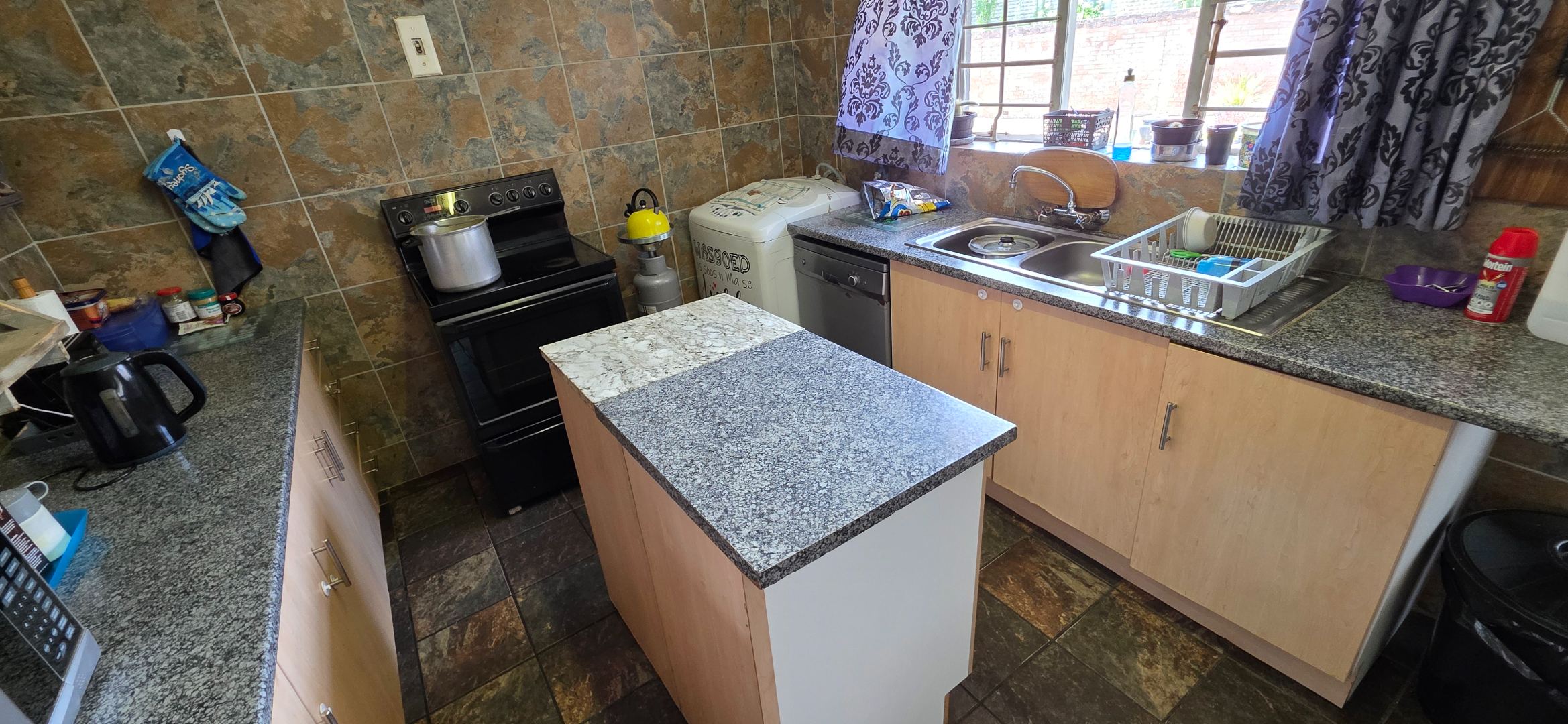 The kitchen has a charming rustic feel and offers practical finishes throughout. It is fitted with melamine countertops, ample built-in cupboards, and a freestanding four-plate stove. A movable centre island provides additional preparation space, while the double sink accommodates a top-loader washing machine. The kitchen flows directly into the dining area, creating a comfortable and functional layout for everyday living.