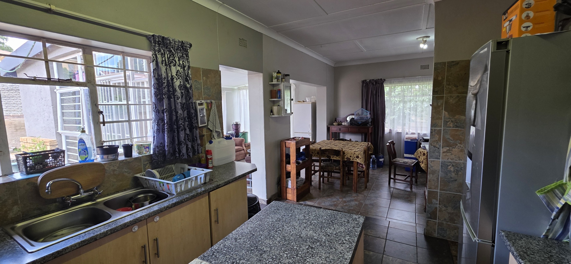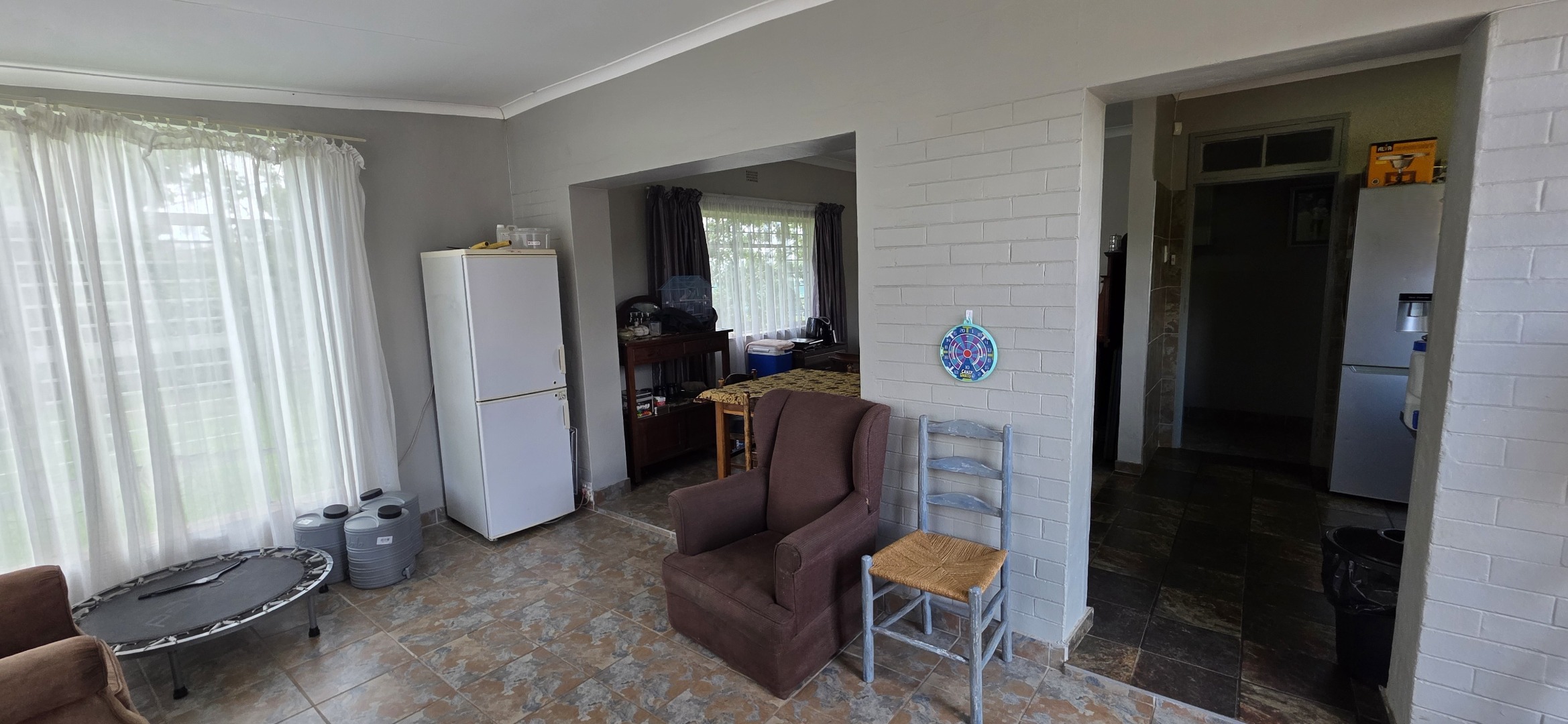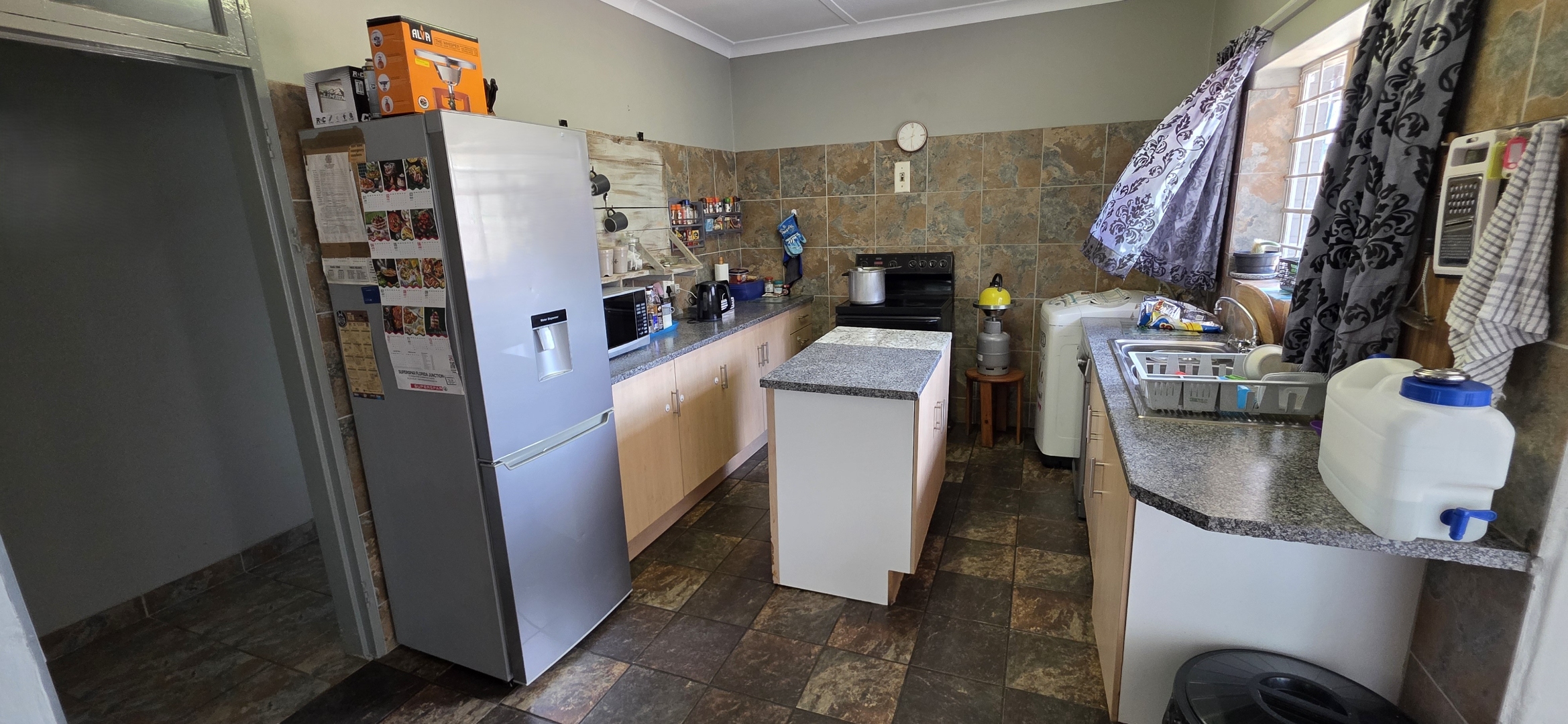 The kitchen has a charming rustic feel and offers practical finishes throughout. It is fitted with melamine countertops, ample built-in cupboards, and a freestanding four-plate stove. A movable centre island provides additional preparation space, while the double sink accommodates a top-loader washing machine. The kitchen flows directly into the dining area, creating a comfortable and functional layout for everyday living.