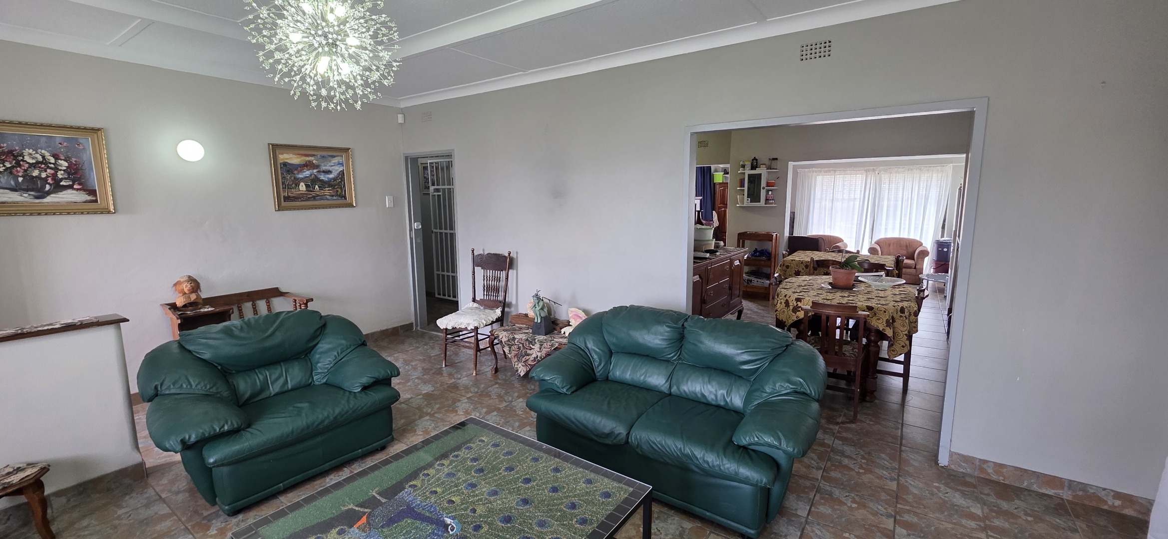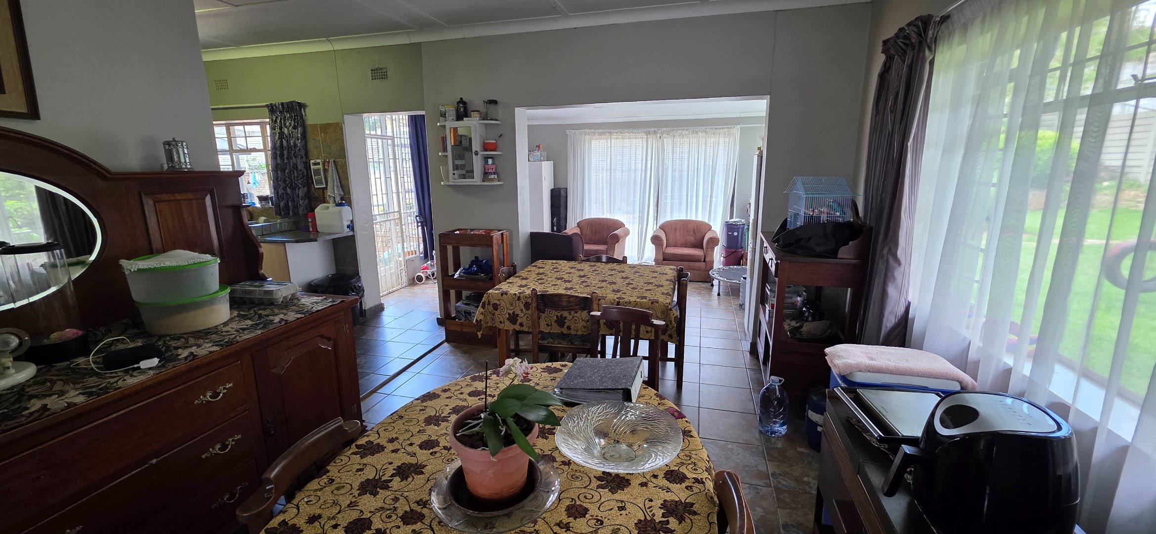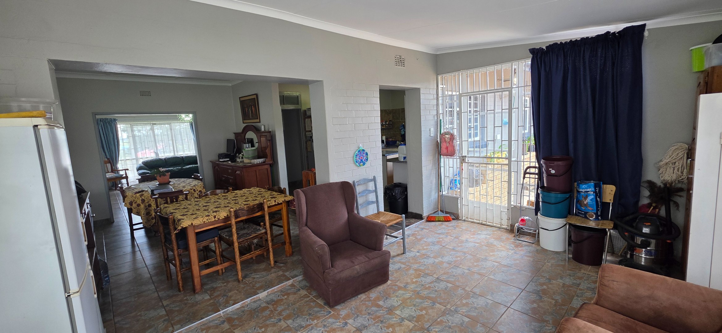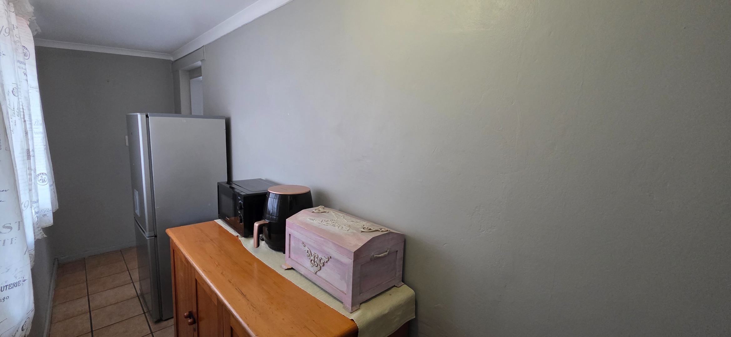 The kitchen has a charming rustic feel and offers practical finishes throughout. It is fitted with melamine countertops, ample built-in cupboards, and a freestanding four-plate stove. A movable centre island provides additional preparation space, while the double sink accommodates a top-loader washing machine. The kitchen flows directly into the dining area, creating a comfortable and functional layout for everyday living.