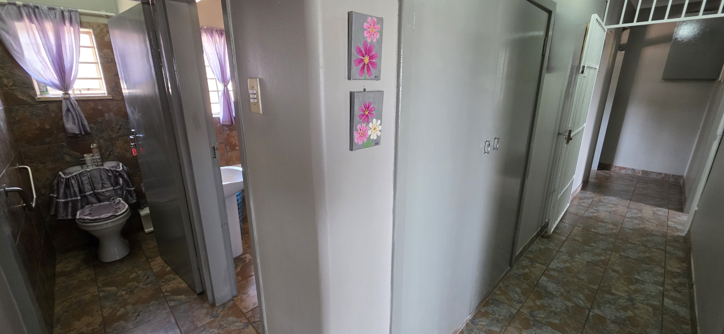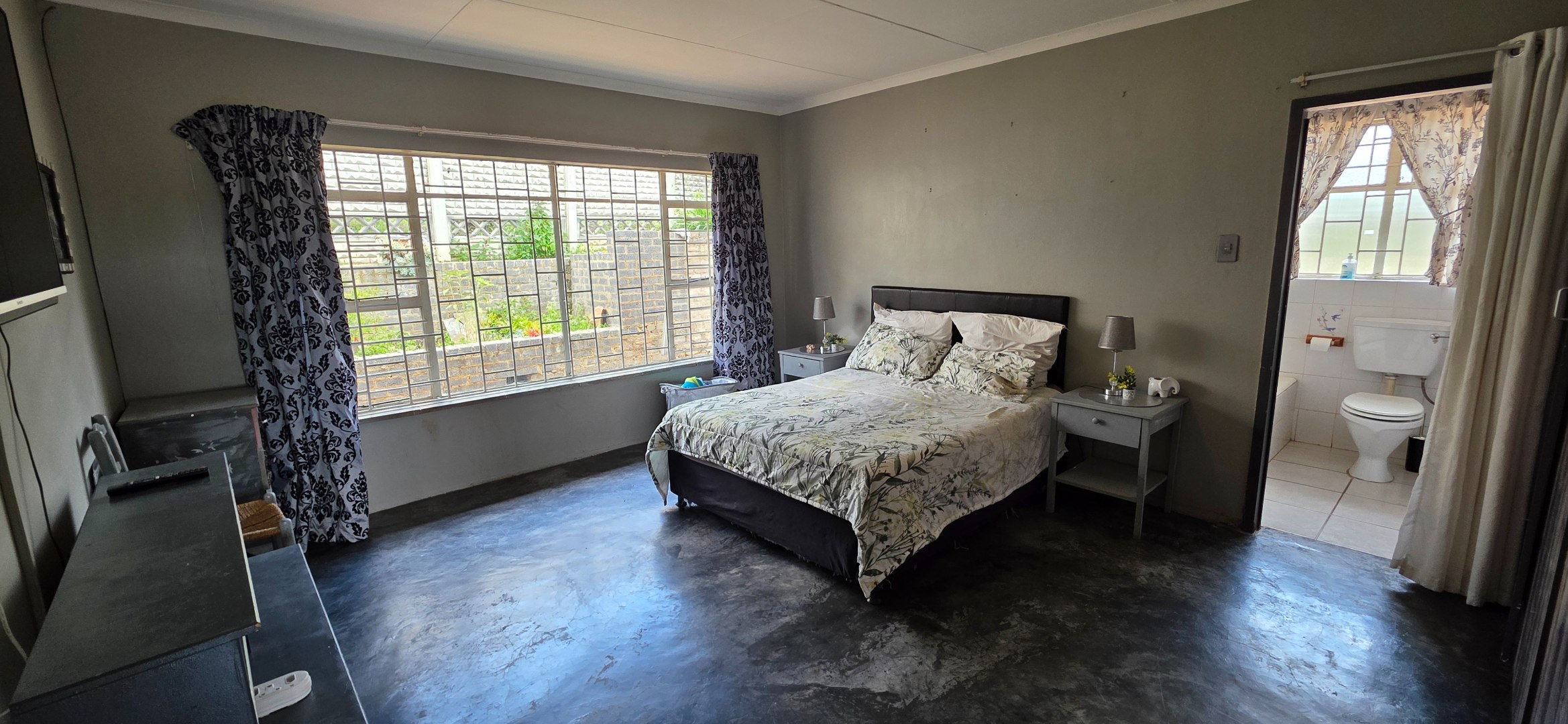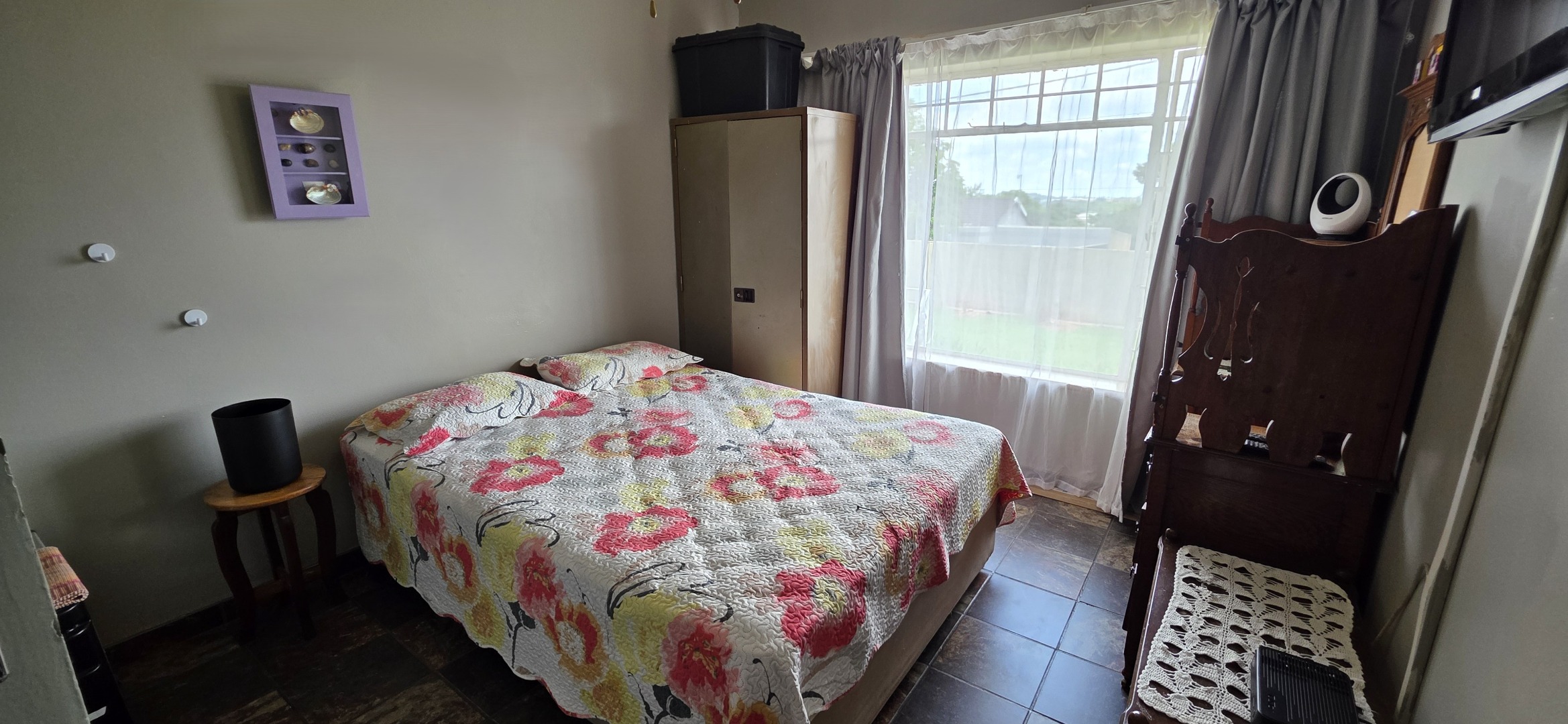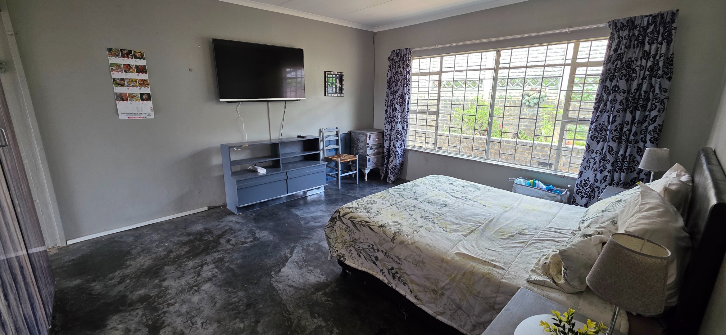 The main house offers three well-sized bedrooms, all fully tiled and fitted with built-in cupboards. Two of the bedrooms are well proportioned and comfortably accommodate a queen- and double-size bed respectively. The main bedroom is notably spacious, offering ample built-in cupboard space and comfortably accommodating a king-size bed. None of the bedrooms in the main house are en-suite.