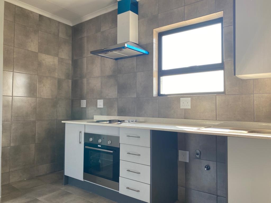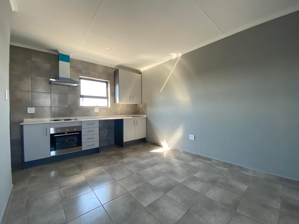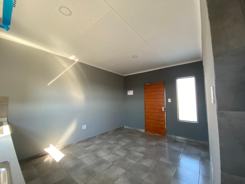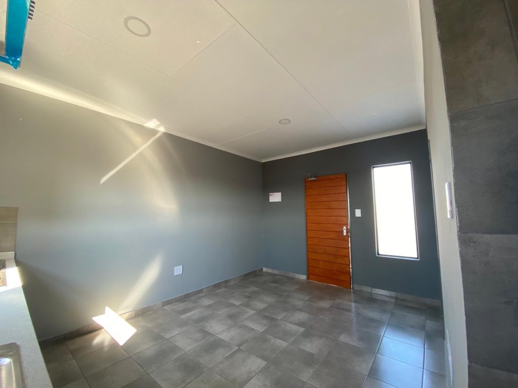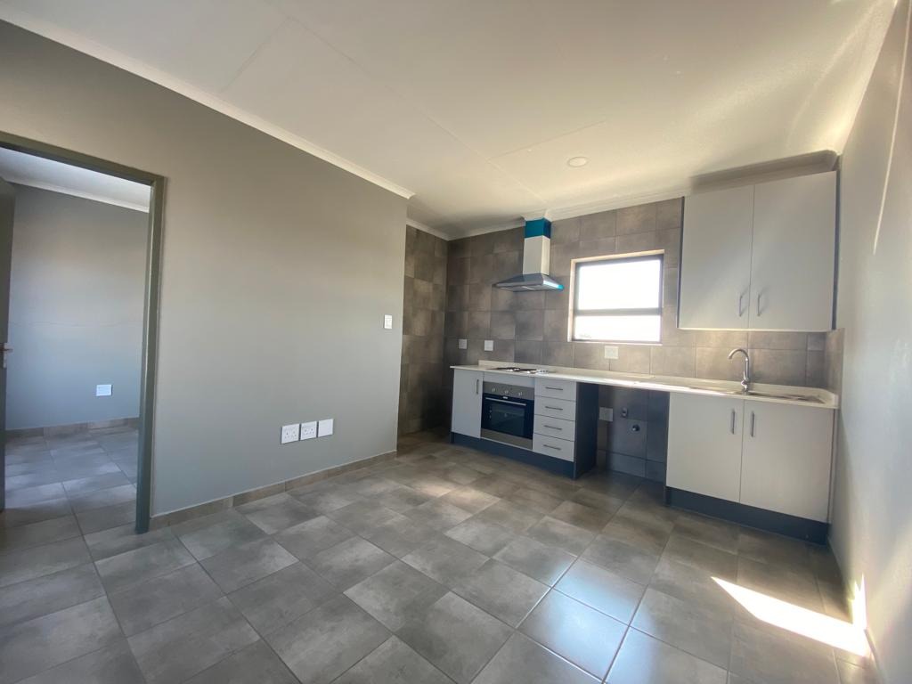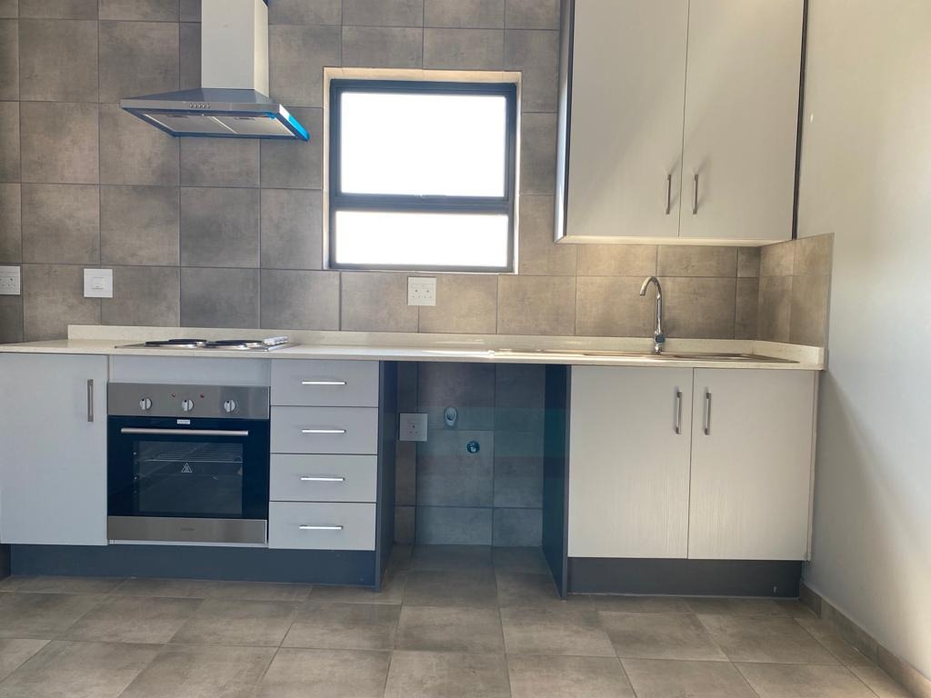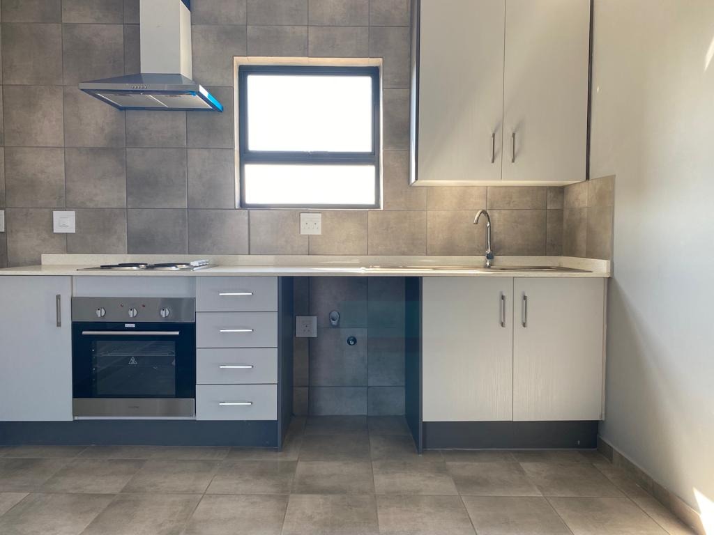 Discover this modern 1-bedroom, 1-bathroom apartment available for rent in the vibrant suburban area of Groblerpark, Roodepoort. Spanning a comfortable 30 square metres, this unit is designed for efficient living. The open-plan layout seamlessly integrates a contemporary kitchen, featuring sleek grey and white cabinetry, built-in oven, hob, and extractor fan. The entire living space boasts durable tiled flooring and freshly painted neutral grey walls, creating a clean and inviting atmosphere. Natural light streams in through well-placed windows, enhancing the bright interior.