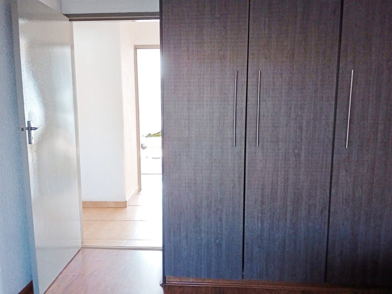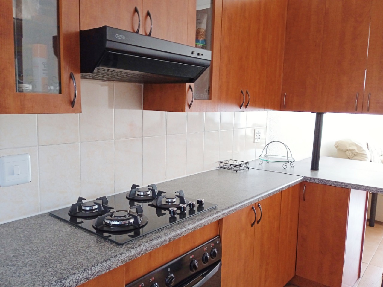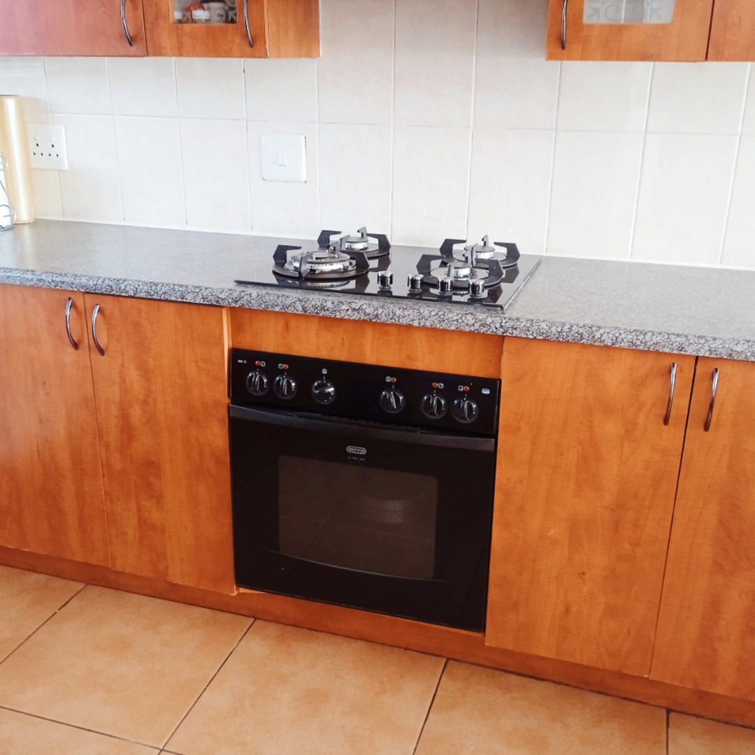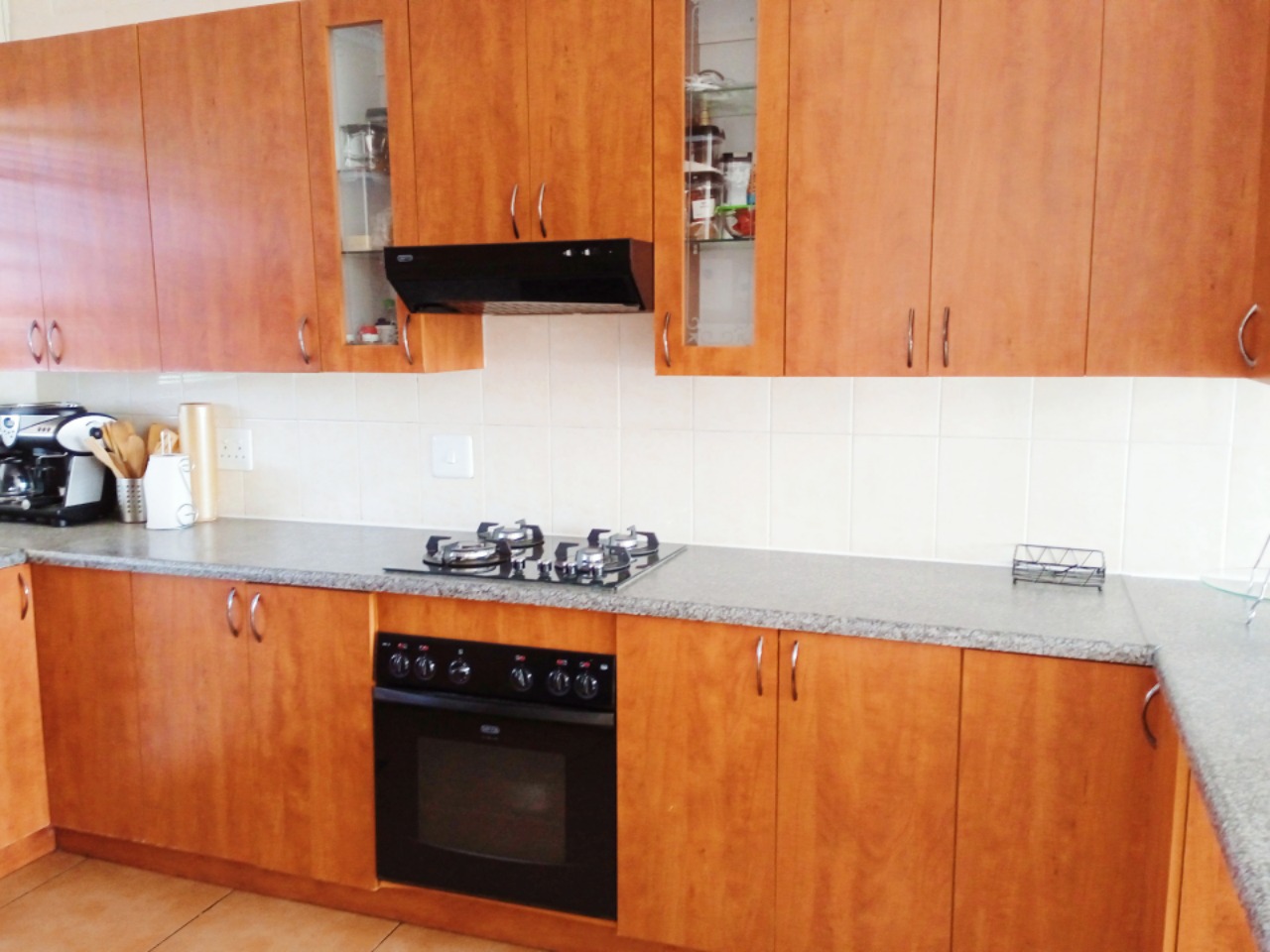 Tiles and laminate flooring throughout, a stunning kitchen with a gas hob, 2 bathrooms (main en-suite), 3 enormous bedrooms with built in cupboards, and a living area large enough to fit a dining suite as well.