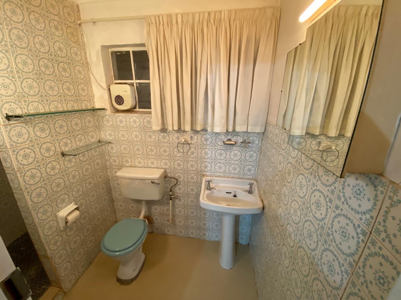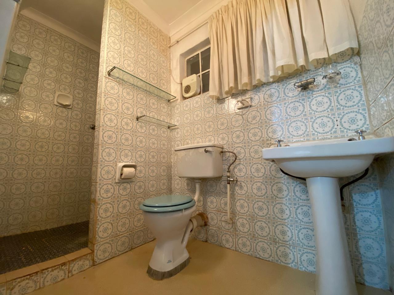 - An en-suite bathroom fitted with a walk-in shower, toilet, and pedestal basin, beautifully complemented by patterned blue-and-white tiles