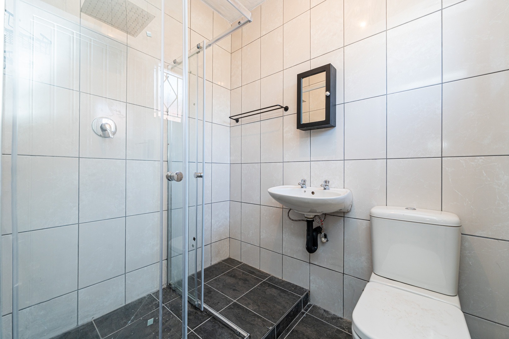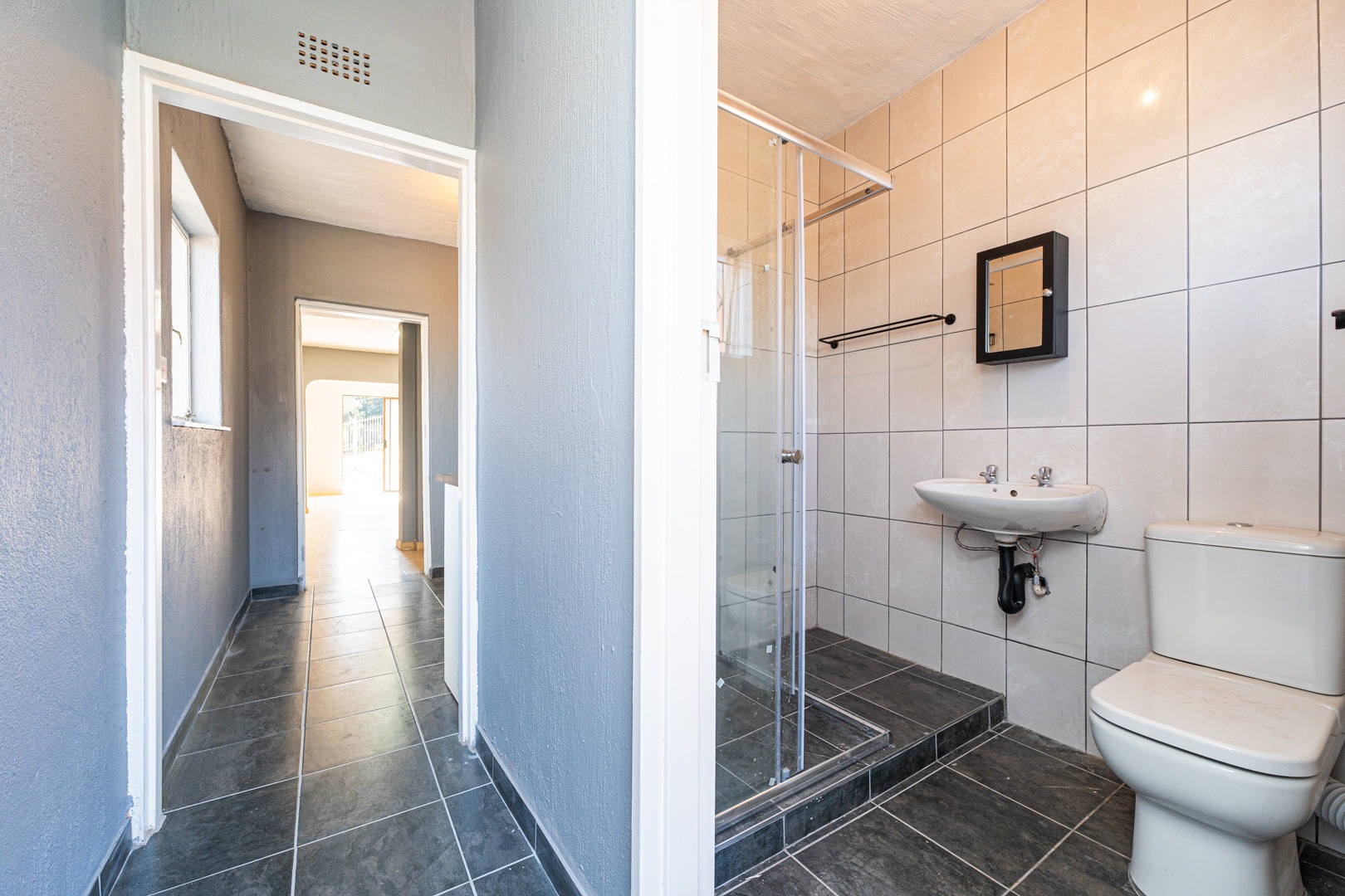 The bathroom is neatly fitted with a shower, basin, and toilet, offering everything you need in a clean, practical layout.