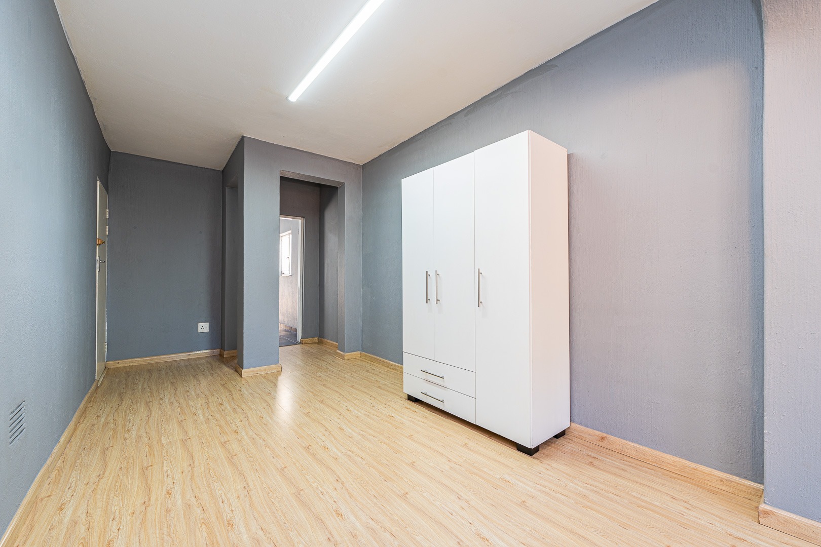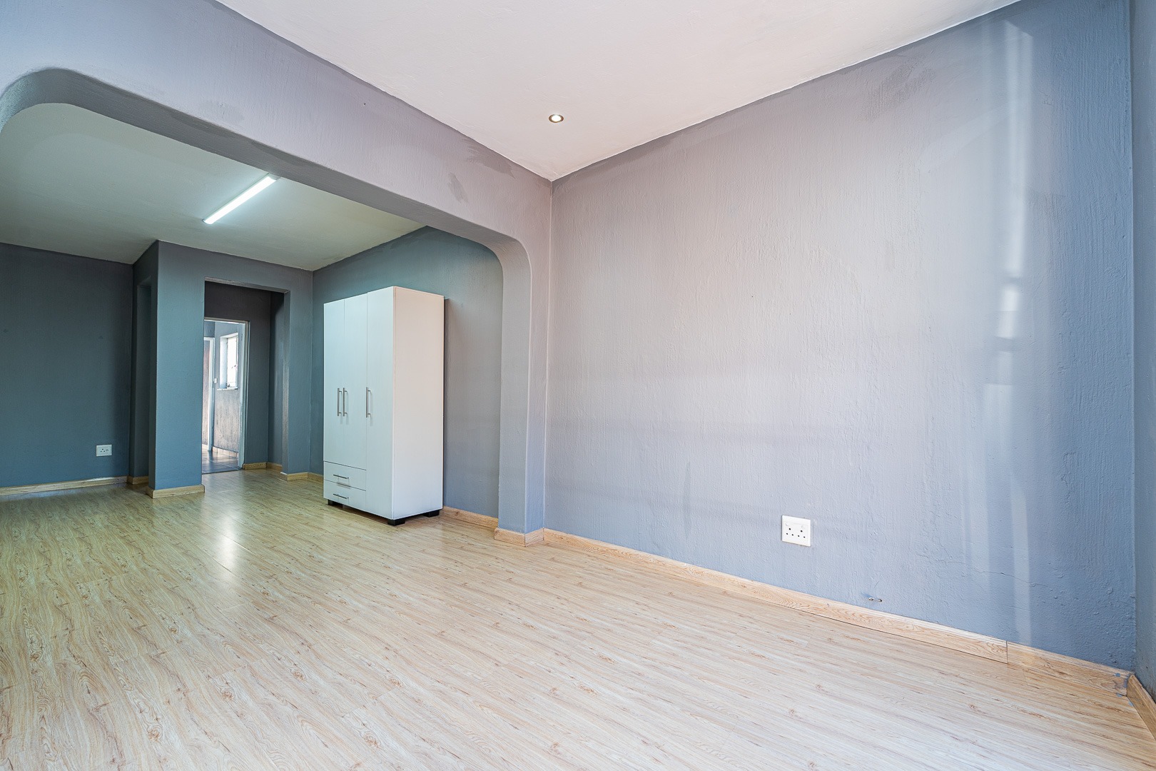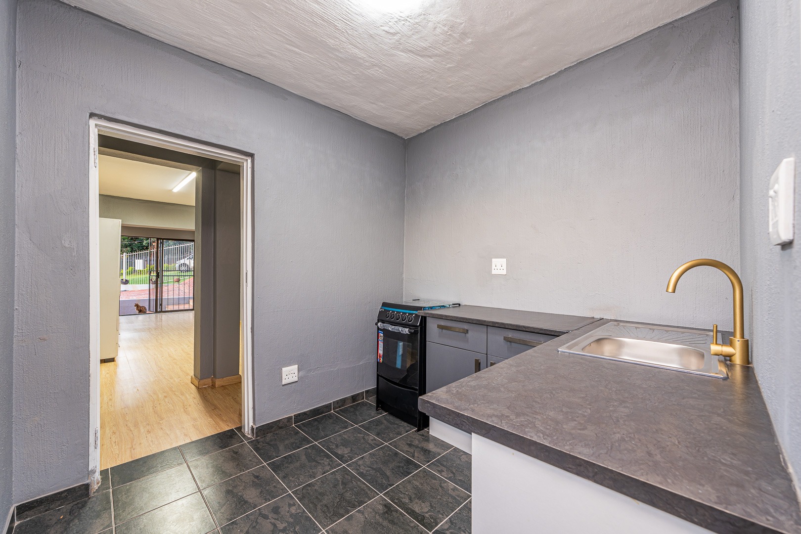 The bedroom and lounge are combined in a spacious open plan layout, finished with stylish melamine flooring that adds warmth and modern appeal. A separate kitchen provides excellent functionality, featuring granite countertops, good cupboard space, and room for everyday cooking needs.