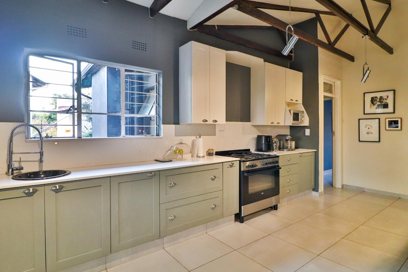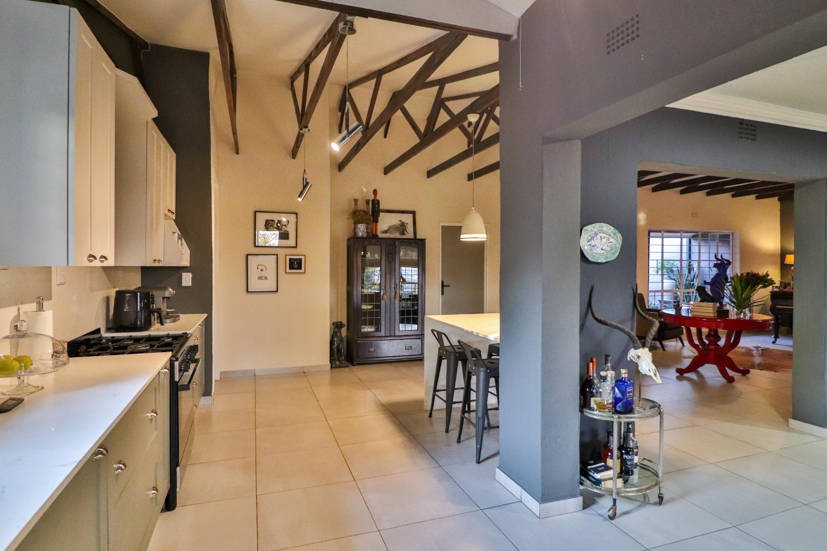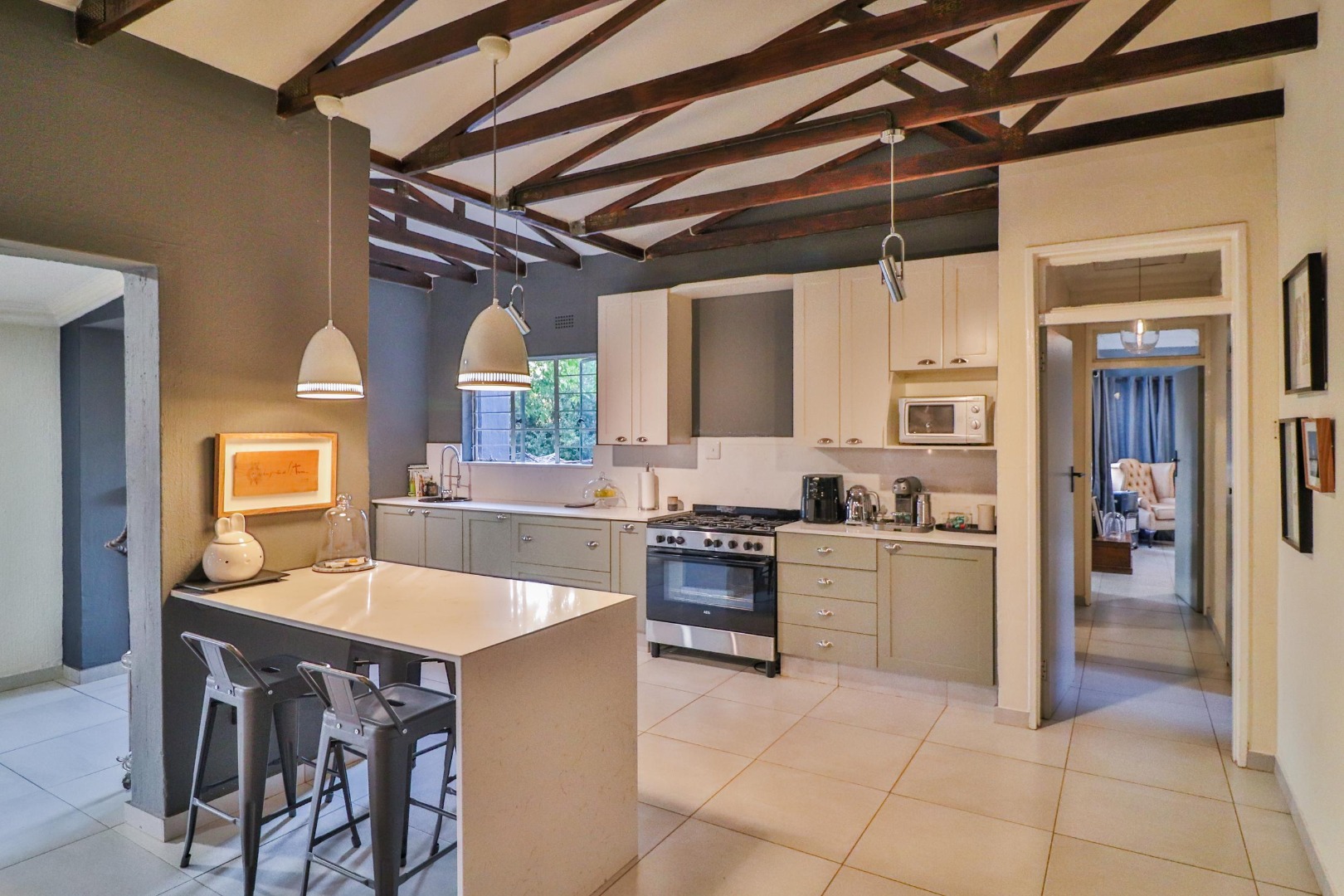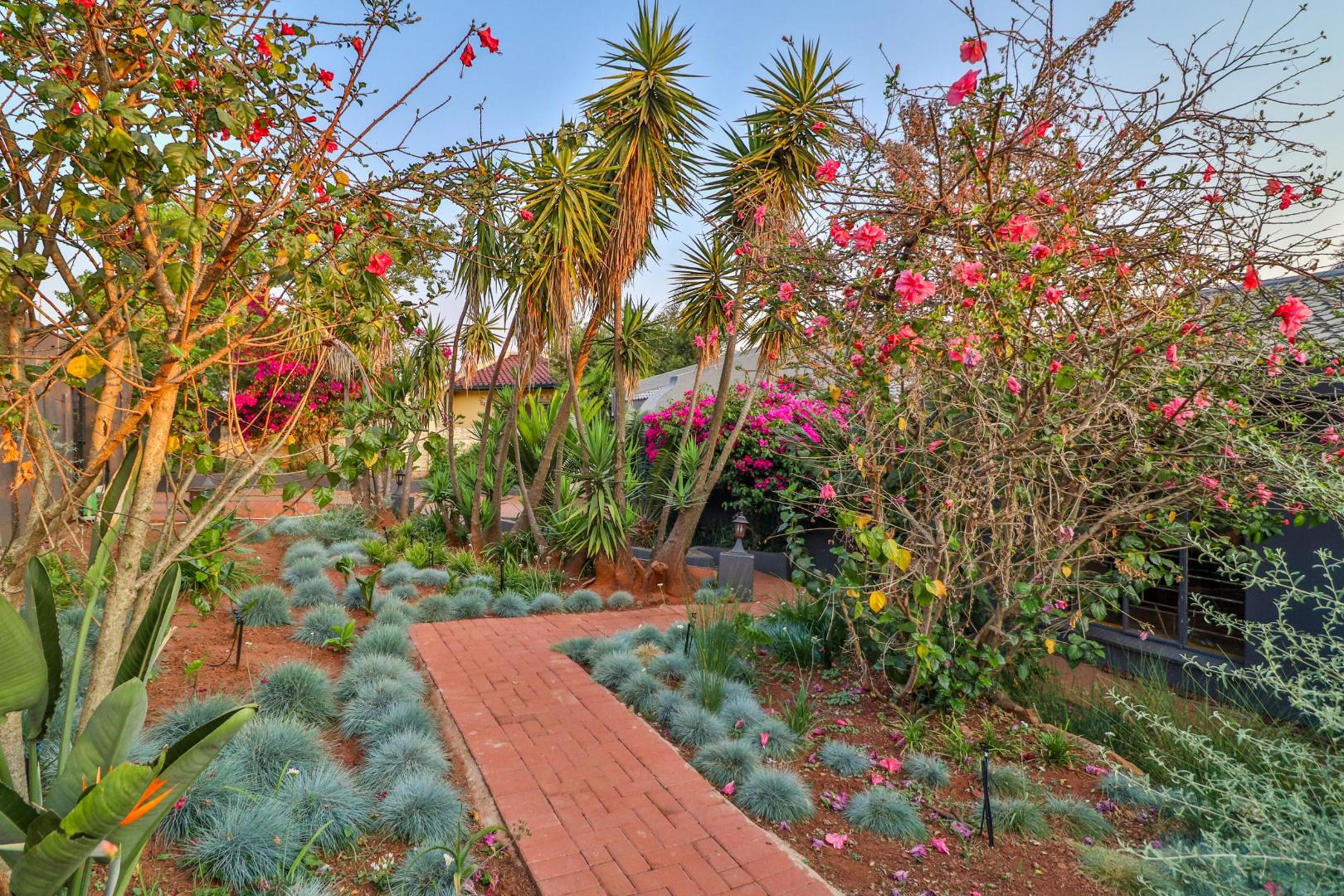 The house has its own private entrance with a motorised gate and one motorised garage with another manual garage. The spacious, welcoming kitchen which is designed for entertaining. Besides for its gas stove which allows for cooking during loadshedding, it has a scullery with space for a double fridge/freezer and three other large appliances as well as ample pantry space. The kitchen is the centre of the home leading either to a corridor to the bedrooms or to two large living spaces. The first is a lofty entrance hall branching to the guest room and study, while the other is a spacious lounge/dining area with a fireplace. There are two other bedrooms, one of which is large enough to have its own small pyjama lounge / play area in it. The guest bathroom has a bath and shower. A study (which can double as a bedroom) houses the wifi unit that also has an inverter for uninterrupted wifi during loadshedding.
