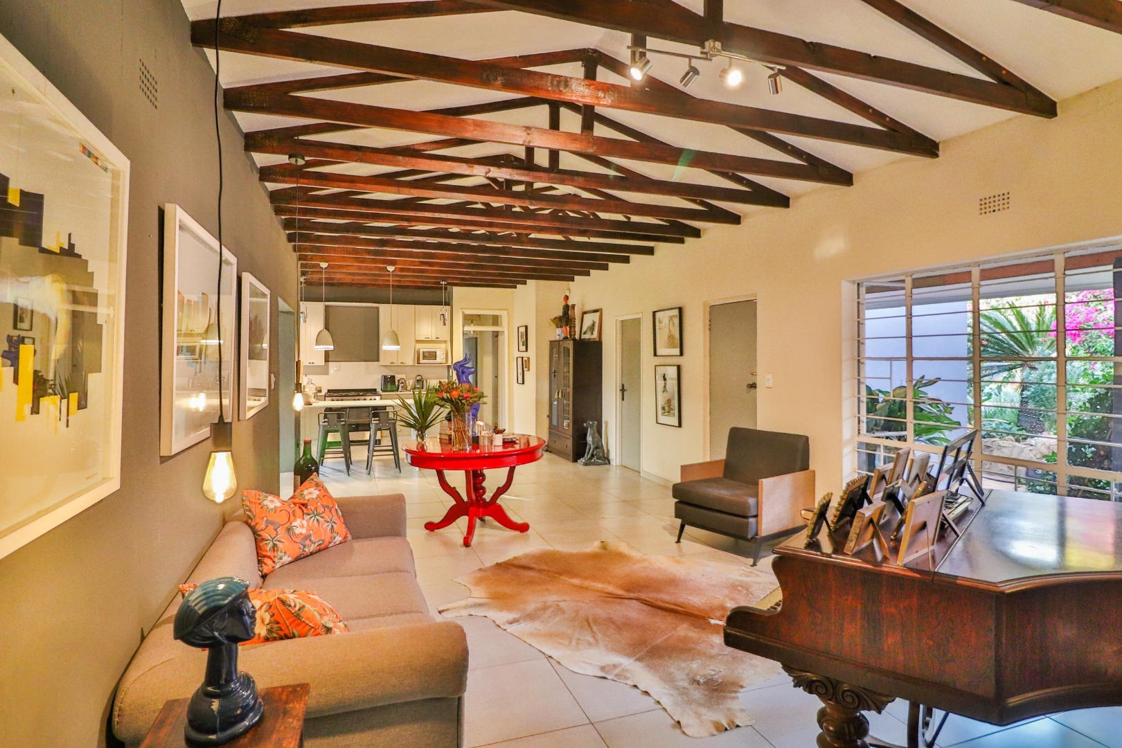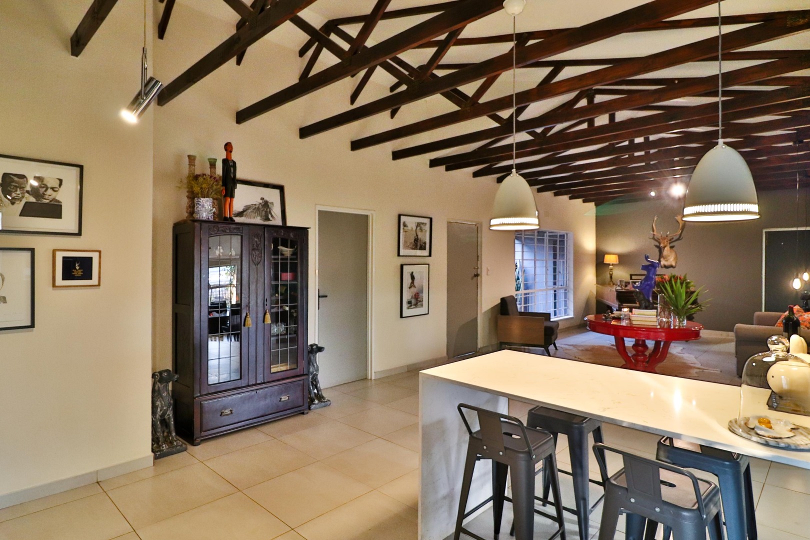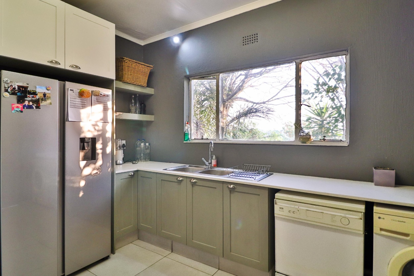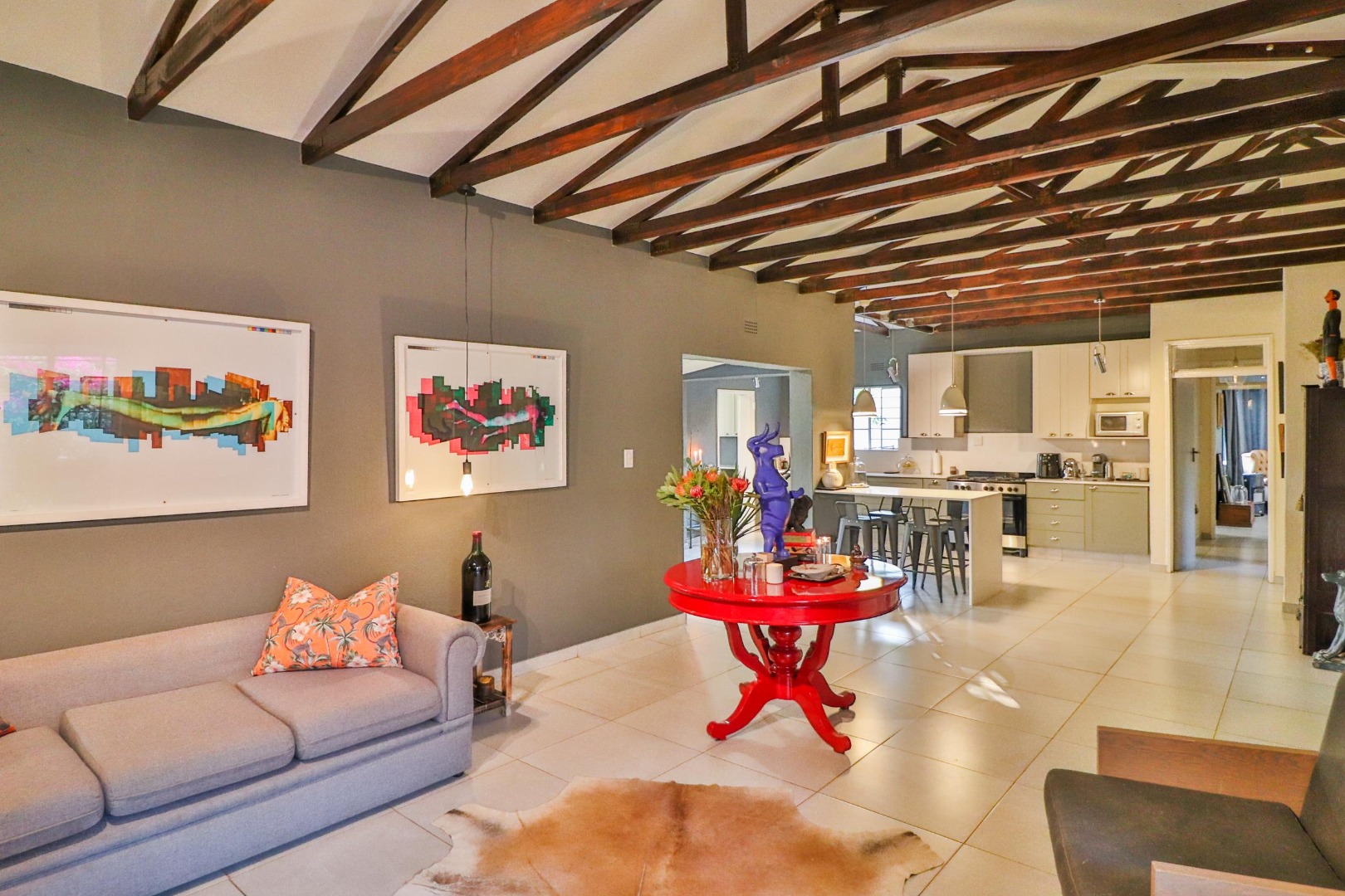 The house has its own private entrance with a motorised gate and one motorised garage with another manual garage. The spacious, welcoming kitchen which is designed for entertaining. Besides for its gas stove which allows for cooking during loadshedding, it has a scullery with space for a double fridge/freezer and three other large appliances as well as ample pantry space. The kitchen is the centre of the home leading either to a corridor to the bedrooms or to two large living spaces. The first is a lofty entrance hall branching to the guest room and study, while the other is a spacious lounge/dining area with a fireplace. There are two other bedrooms, one of which is large enough to have its own small pyjama lounge / play area in it. The guest bathroom has a bath and shower. A study (which can double as a bedroom) houses the wifi unit that also has an inverter for uninterrupted wifi during loadshedding.