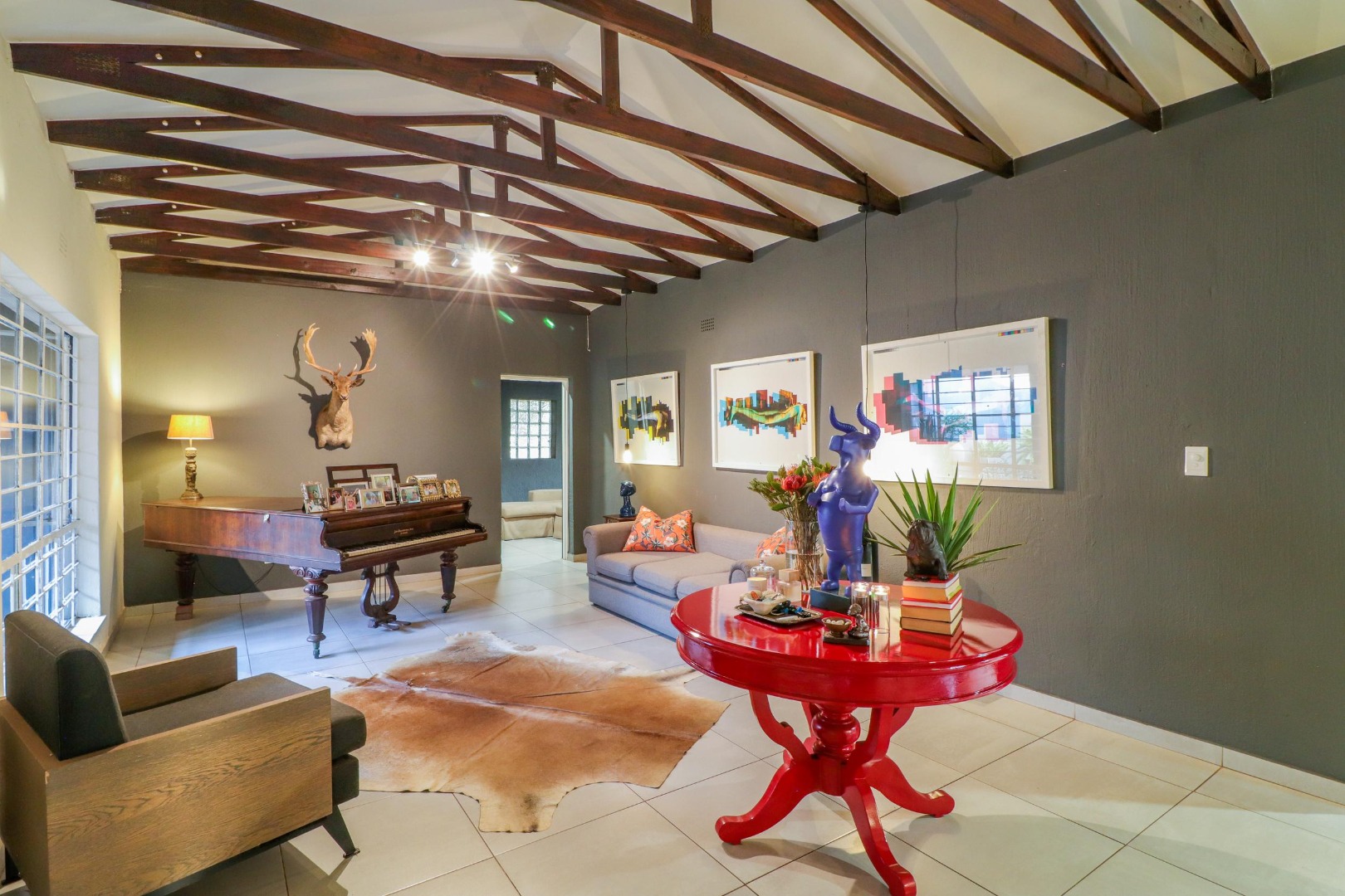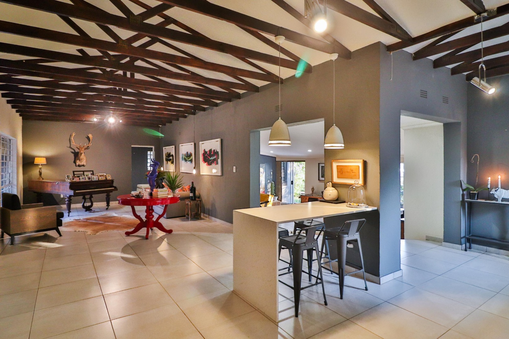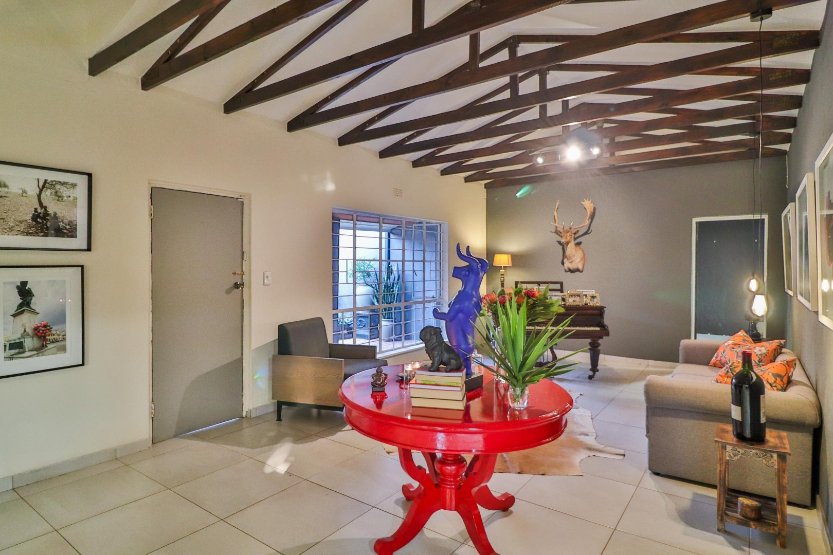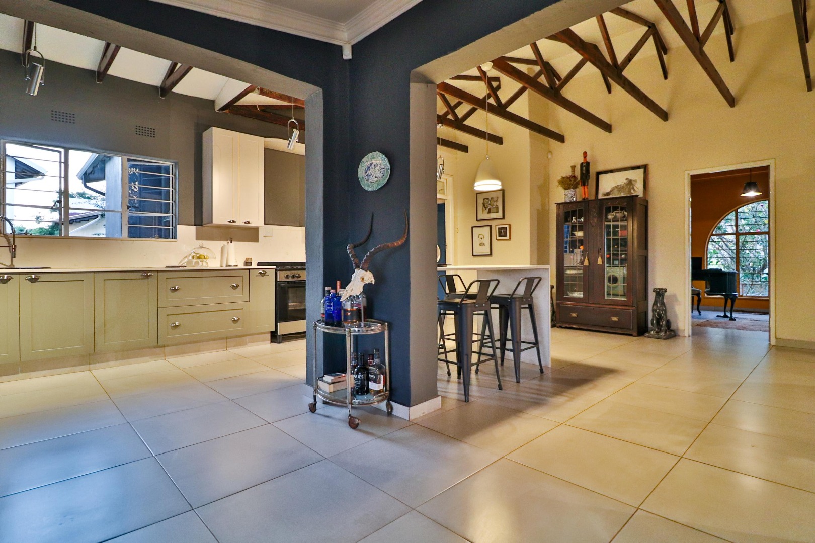 The house has its own private entrance with a motorised gate and one motorised garage with another manual garage. The spacious, welcoming kitchen which is designed for entertaining. Besides for its gas stove which allows for cooking during loadshedding, it has a scullery with space for a double fridge/freezer and three other large appliances as well as ample pantry space. The kitchen is the centre of the home leading either to a corridor to the bedrooms or to two large living spaces. The first is a lofty entrance hall branching to the guest room and study, while the other is a spacious lounge/dining area with a fireplace. There are two other bedrooms, one of which is large enough to have its own small pyjama lounge / play area in it. The guest bathroom has a bath and shower. A study (which can double as a bedroom) houses the wifi unit that also has an inverter for uninterrupted wifi during loadshedding.