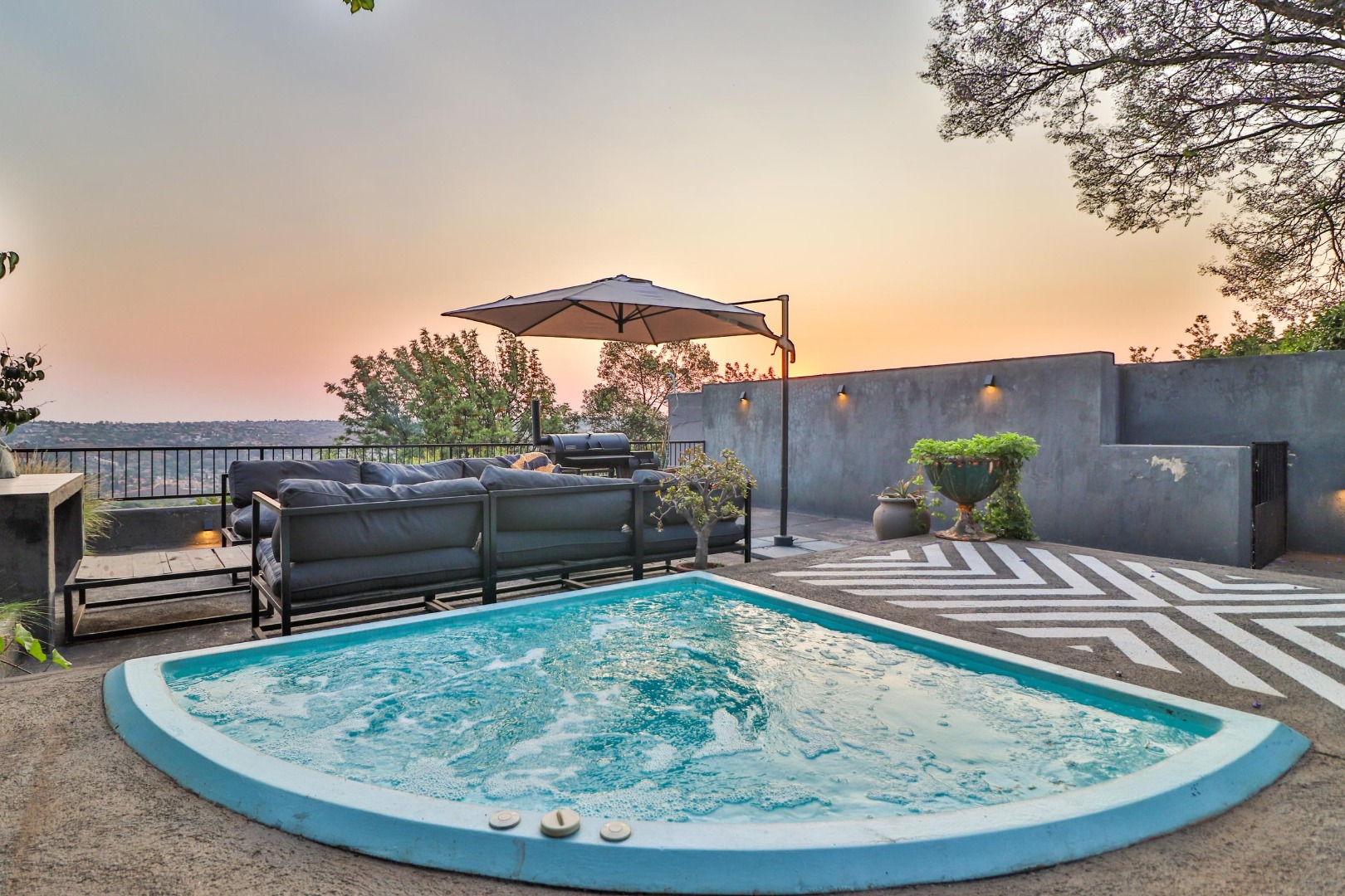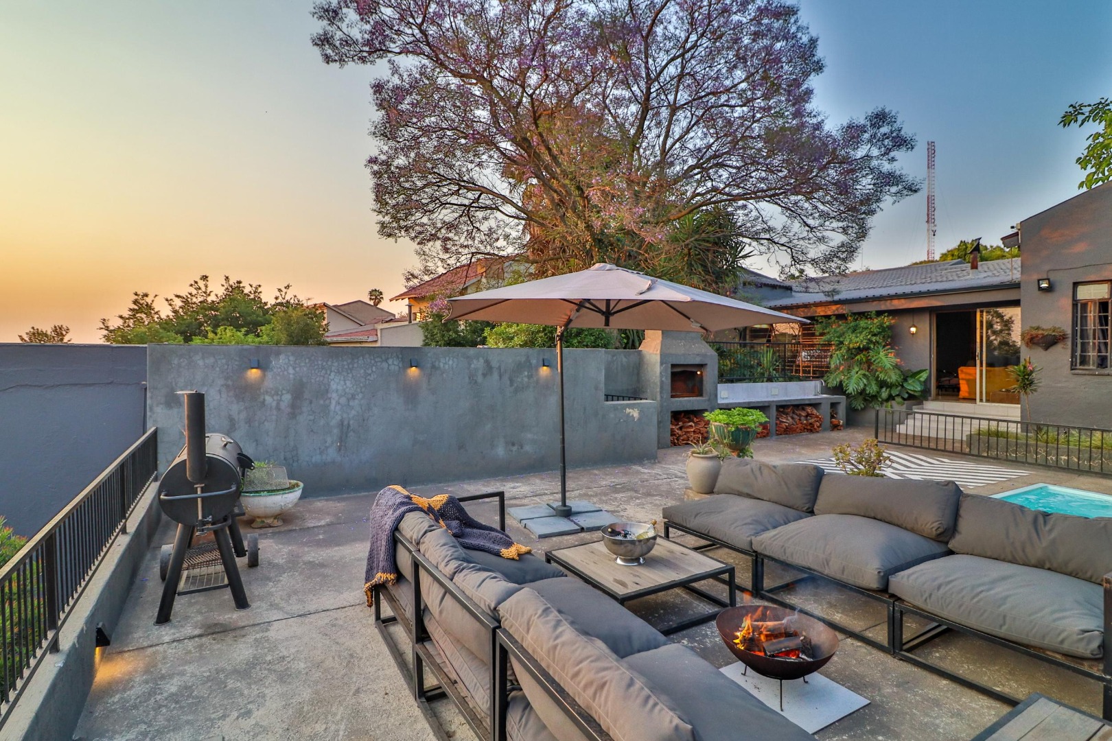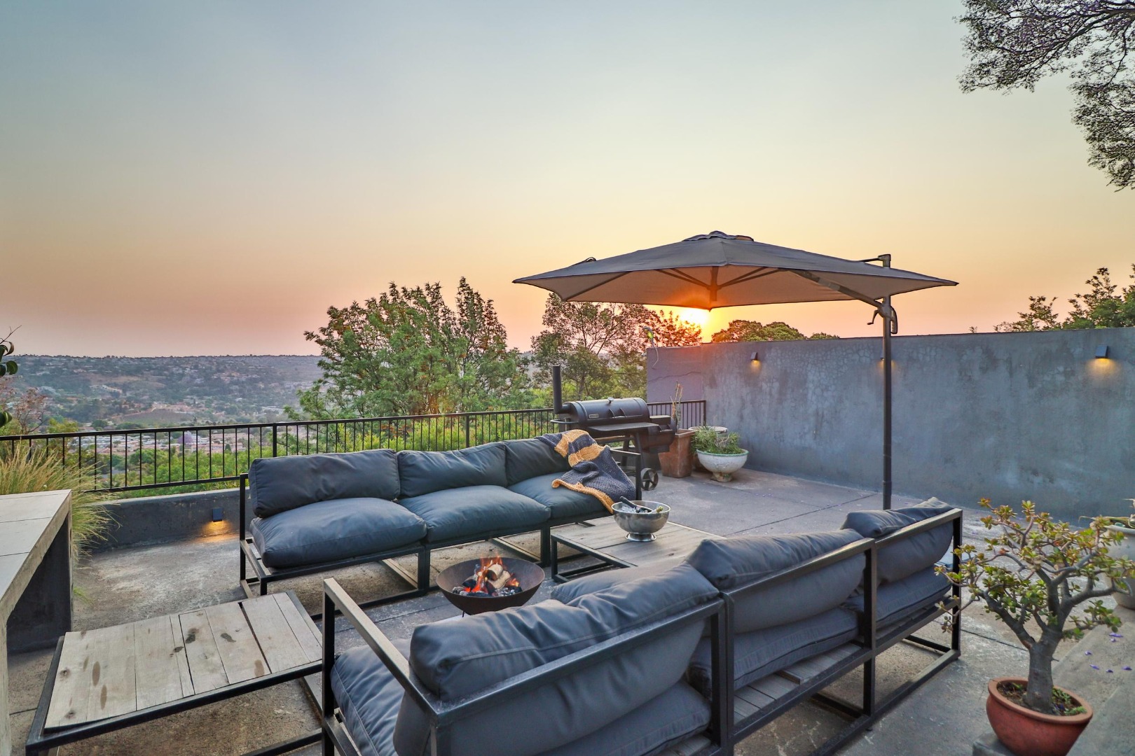 From the lounge area one walks out to breath-taking views of the valley below onto a sundeck fitted with a jacuzzi and braai area for the summer months, while a cosy firepit provides for outdoor entertaining on chilly nights. The wifi system gives coverage to the entire house and sundeck.