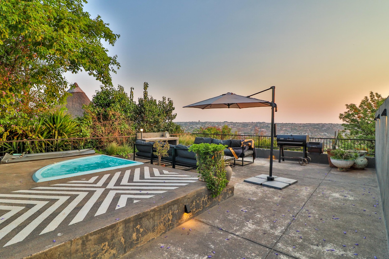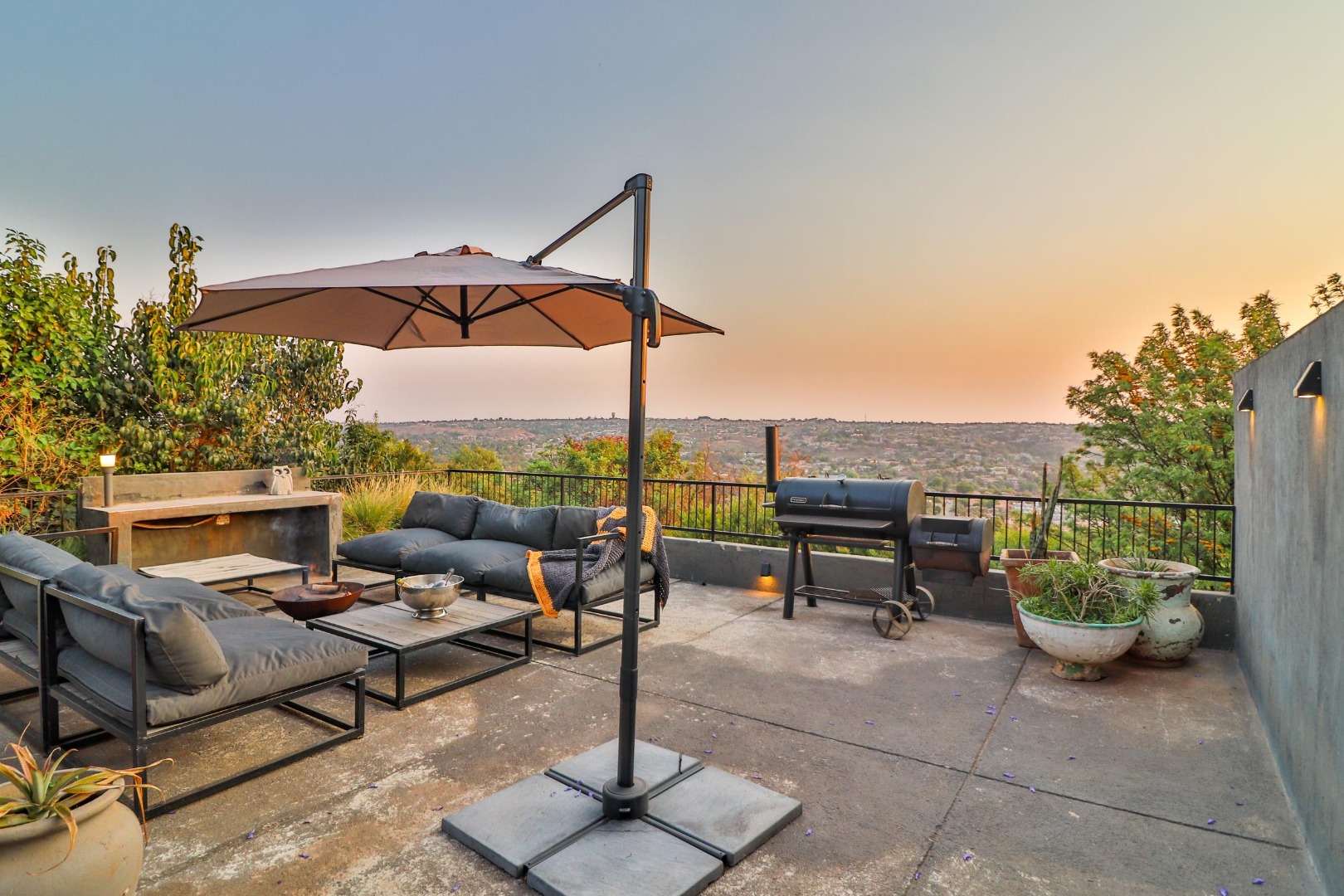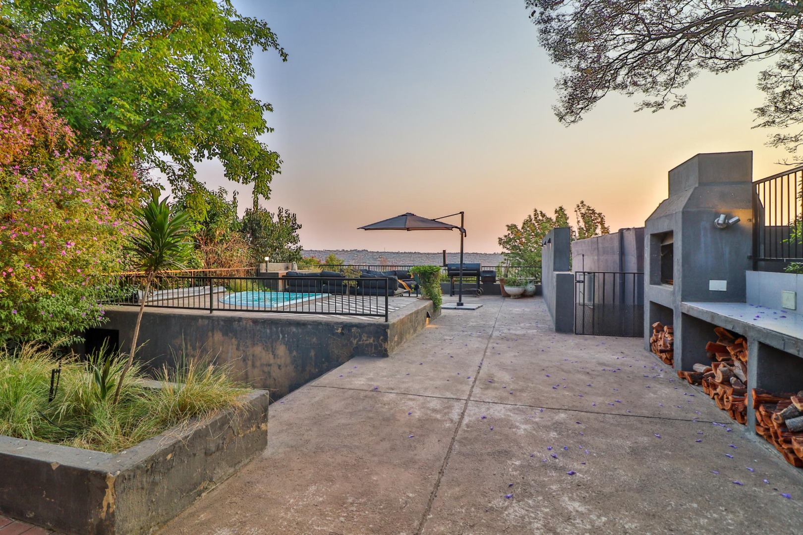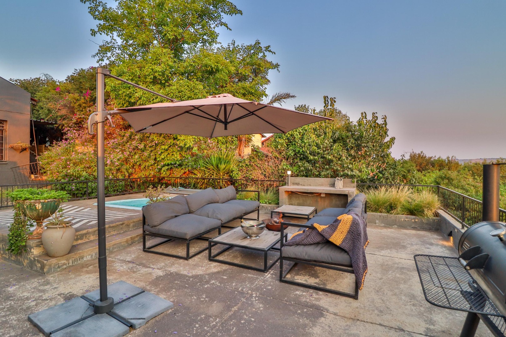 From the lounge area one walks out to breath-taking views of the valley below onto a sundeck fitted with a jacuzzi and braai area for the summer months, while a cosy firepit provides for outdoor entertaining on chilly nights. The wifi system gives coverage to the entire house and sundeck.