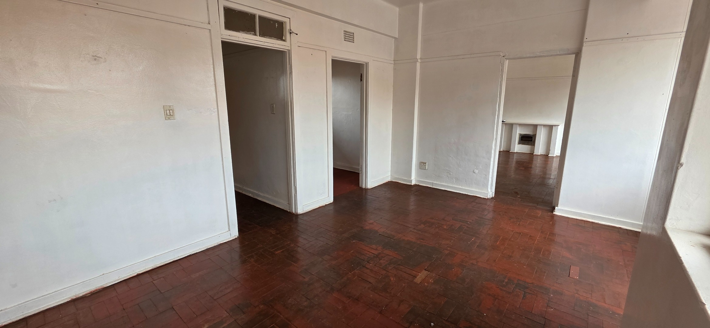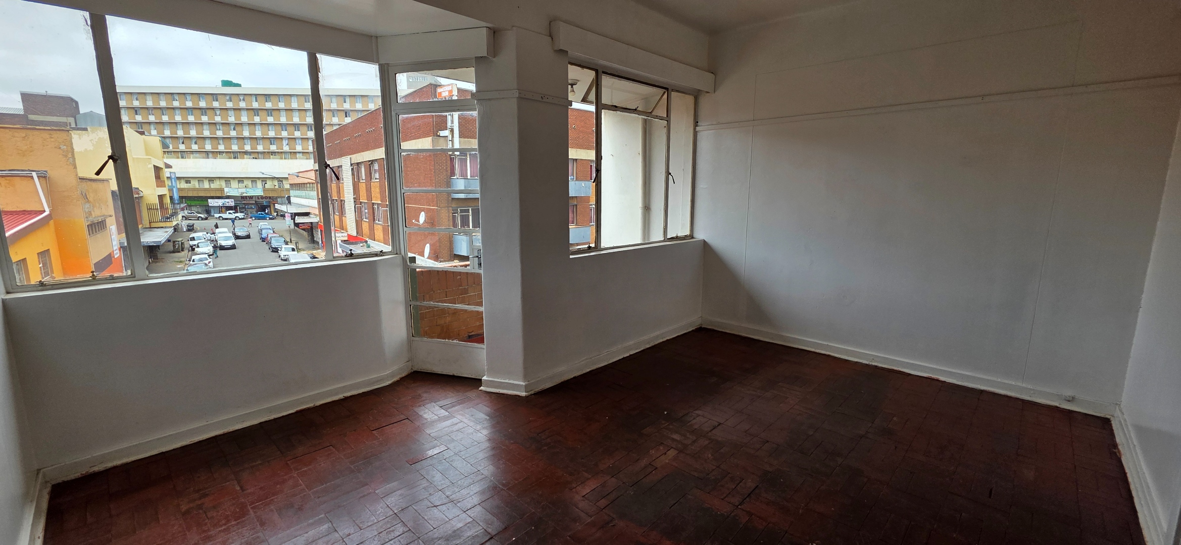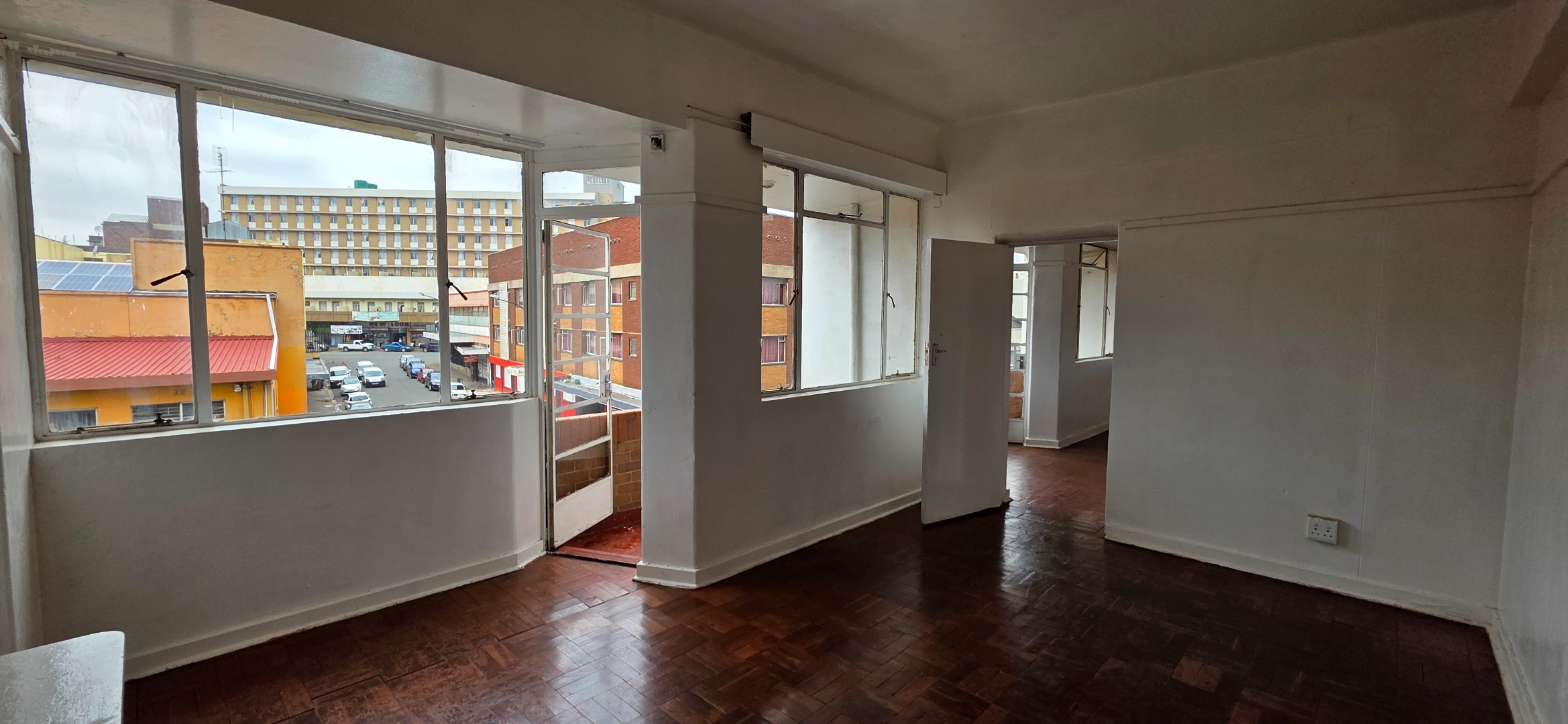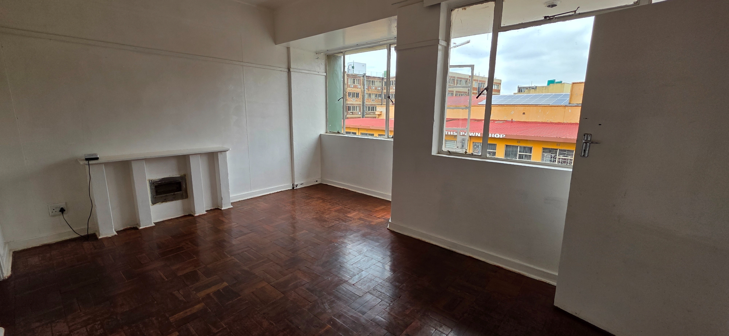 This well-laid-out one-bedroom double flat in the Elares Building offers excellent value for tenants seeking space, functionality, and affordability in a central location. The unit features two separate lounge areas, creating flexible living zones that can be used as a lounge and dining area, work-from-home space, or additional seating area. Large windows throughout allow plenty of natural light, while the parquet flooring adds warmth and durability to the living spaces.