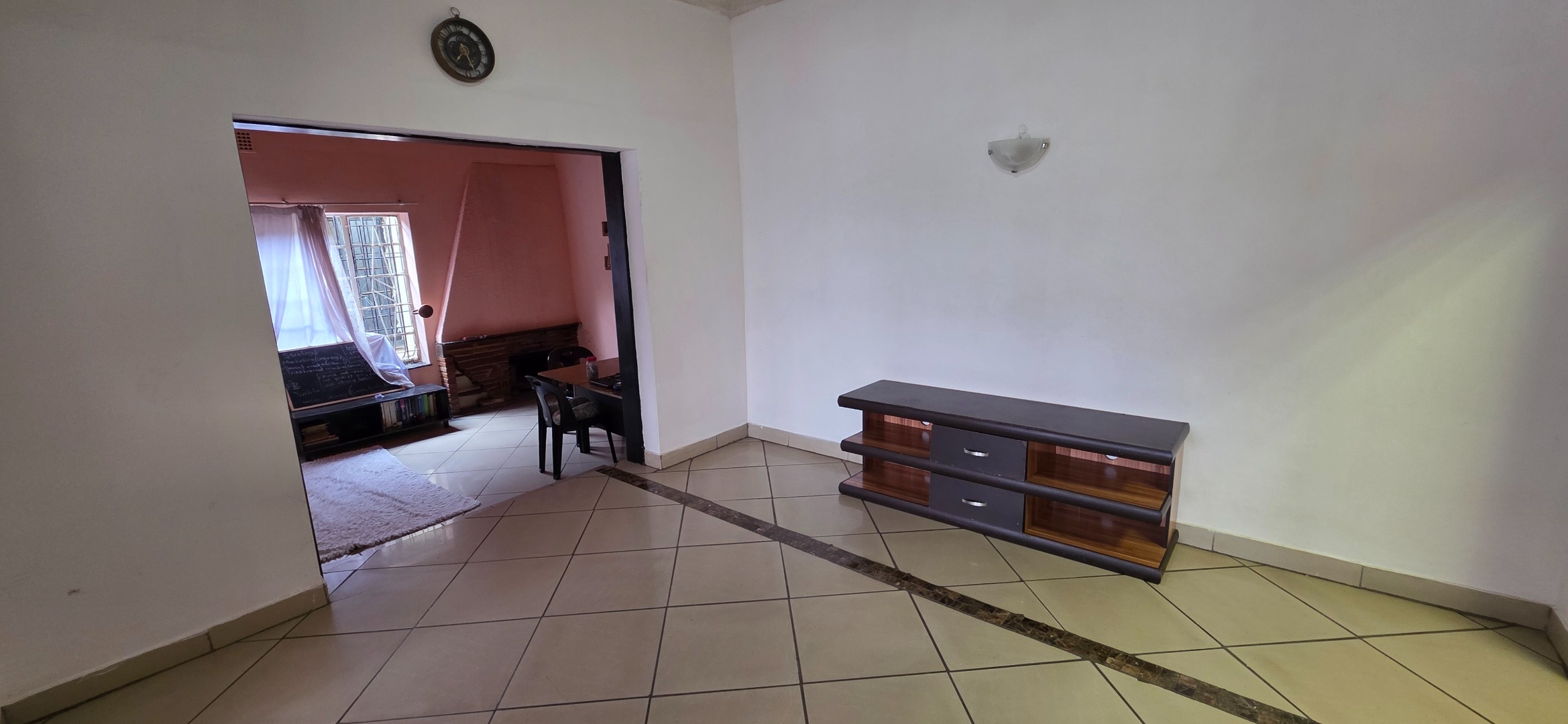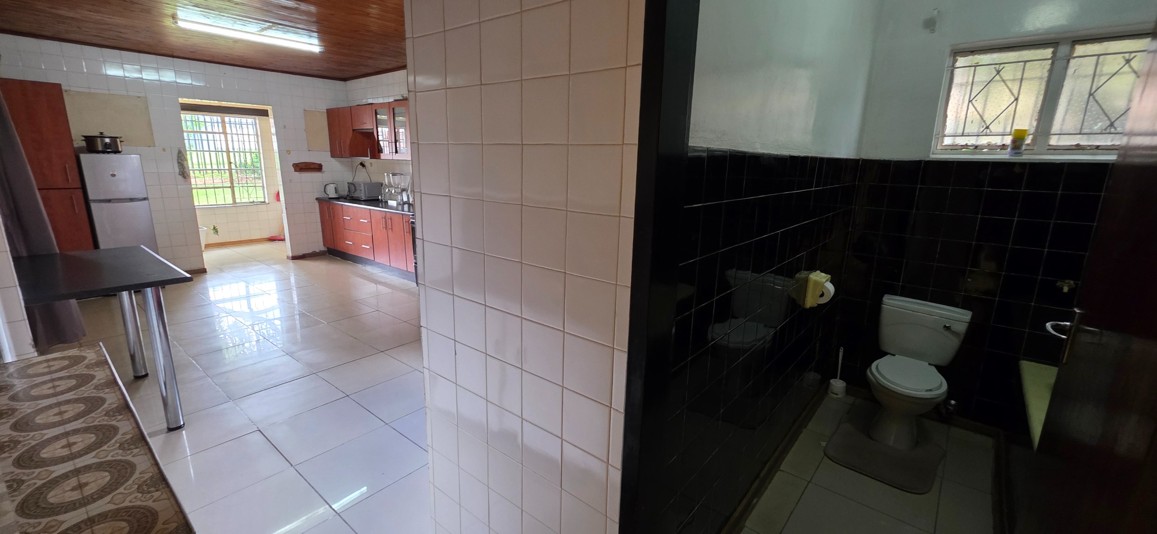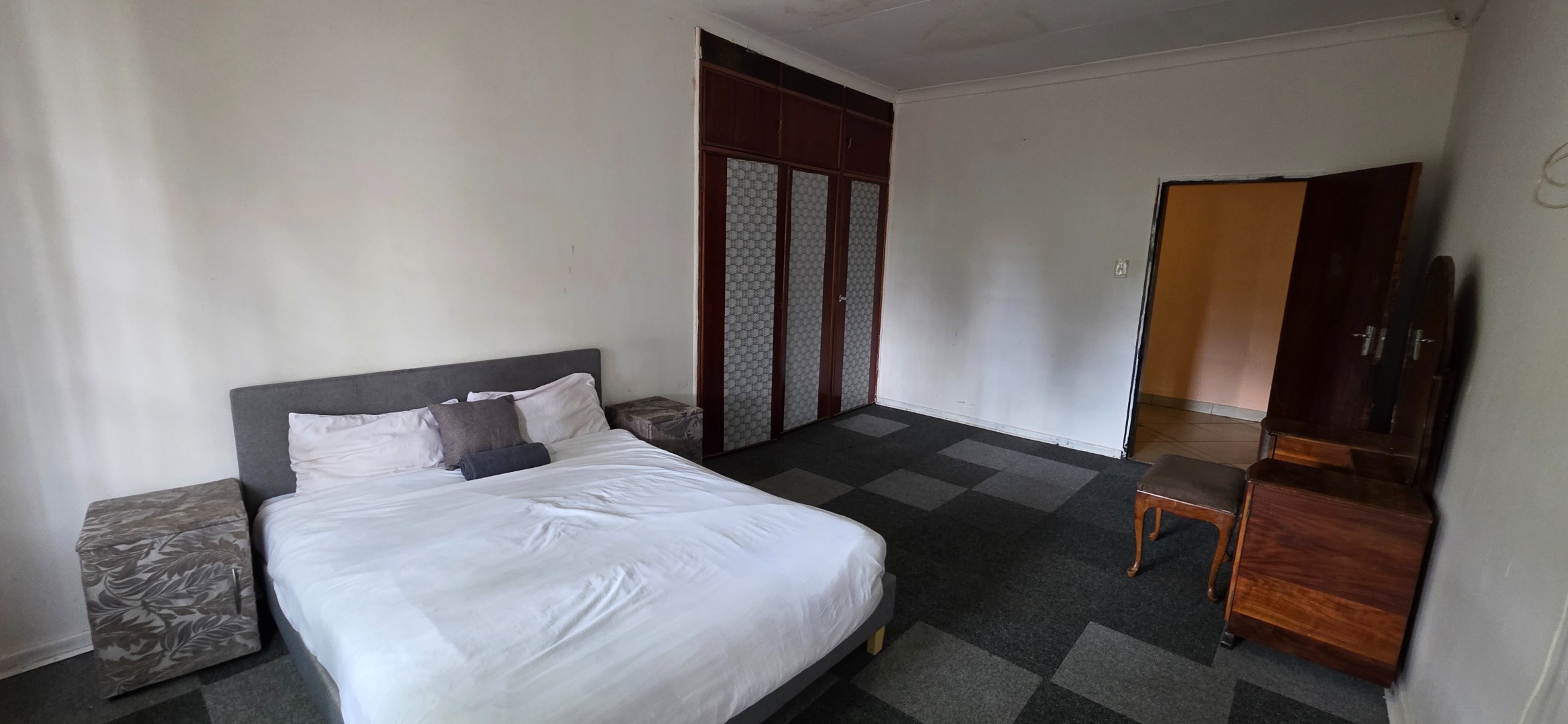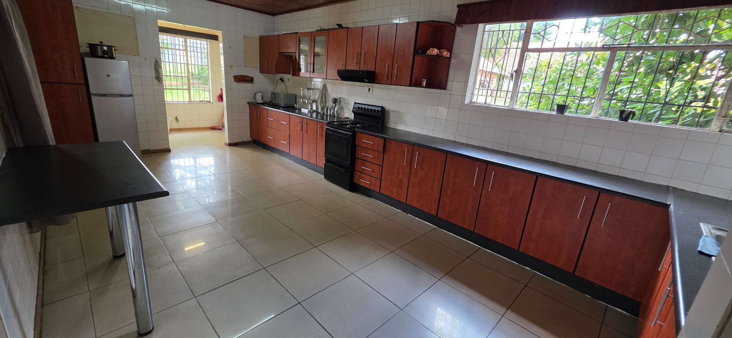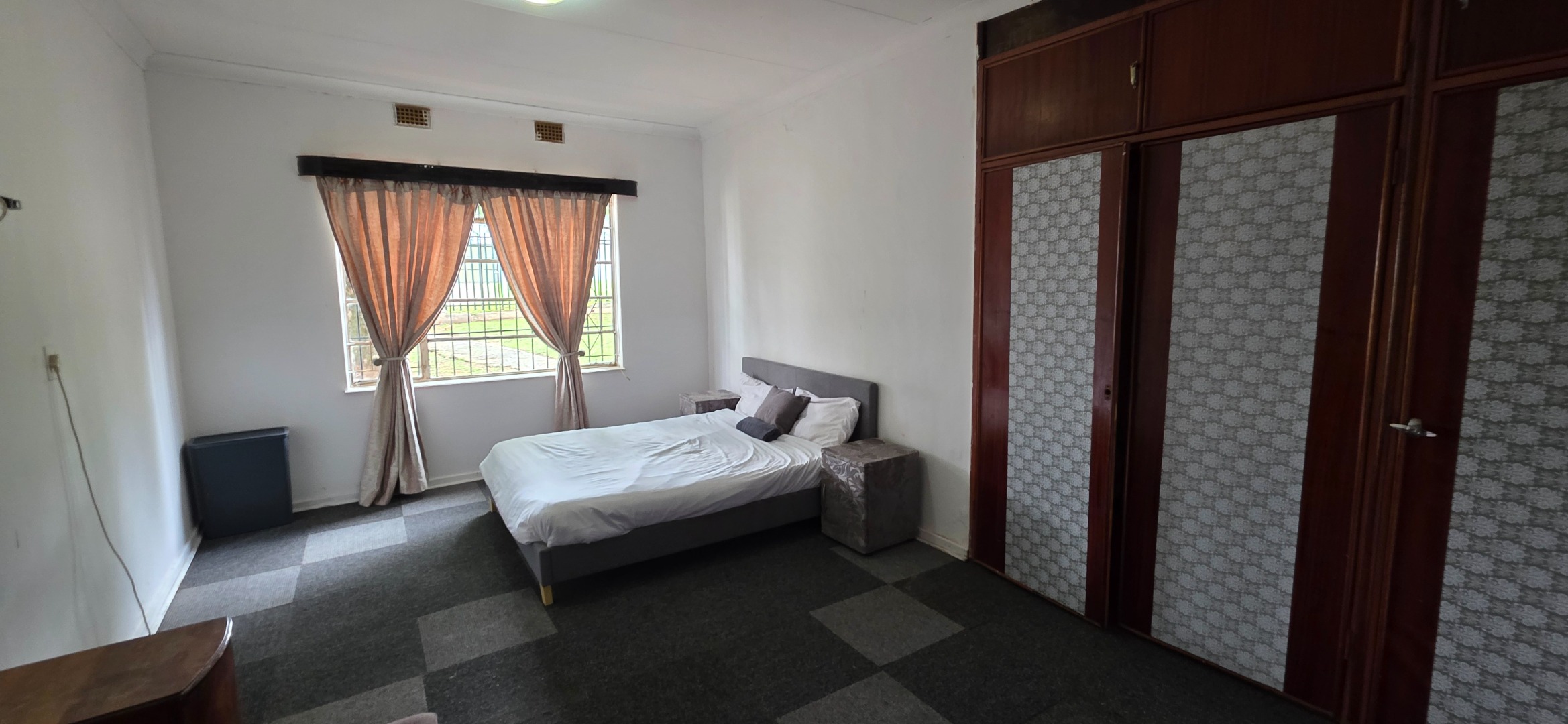 The main house offers three bedrooms. Two of the bedrooms are exceptionally large and can comfortably accommodate king-size beds, while the third bedroom is smaller and best suited to a queen-size bed. The two larger bedrooms offer enough space to include additional furniture such as a small lounge area, dressing space, or work-from-home setup. All bedrooms enjoy good natural light through large windows fitted with security bars, and built-in cupboards are provided.