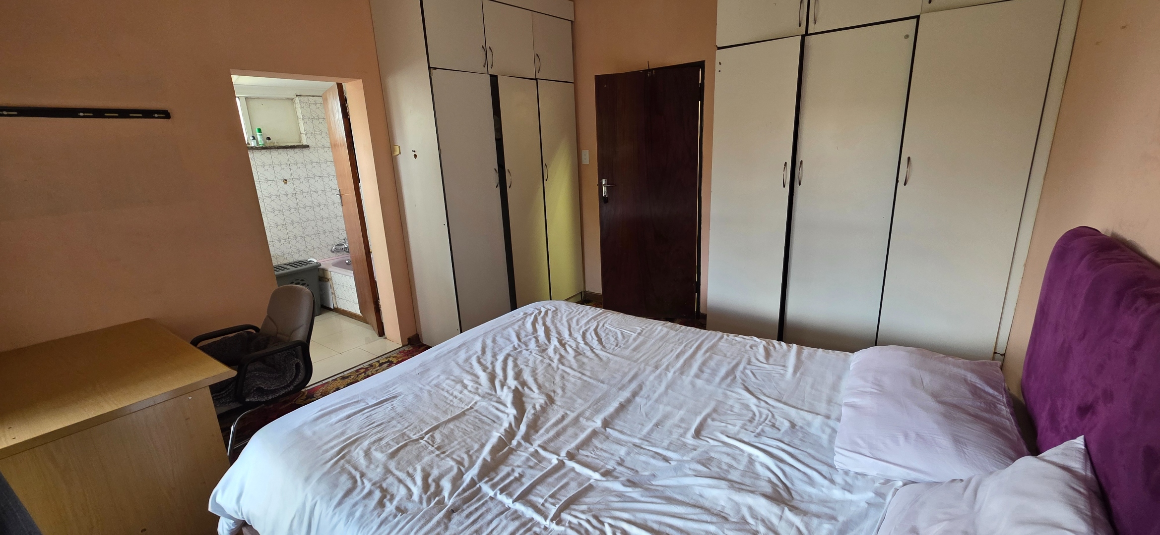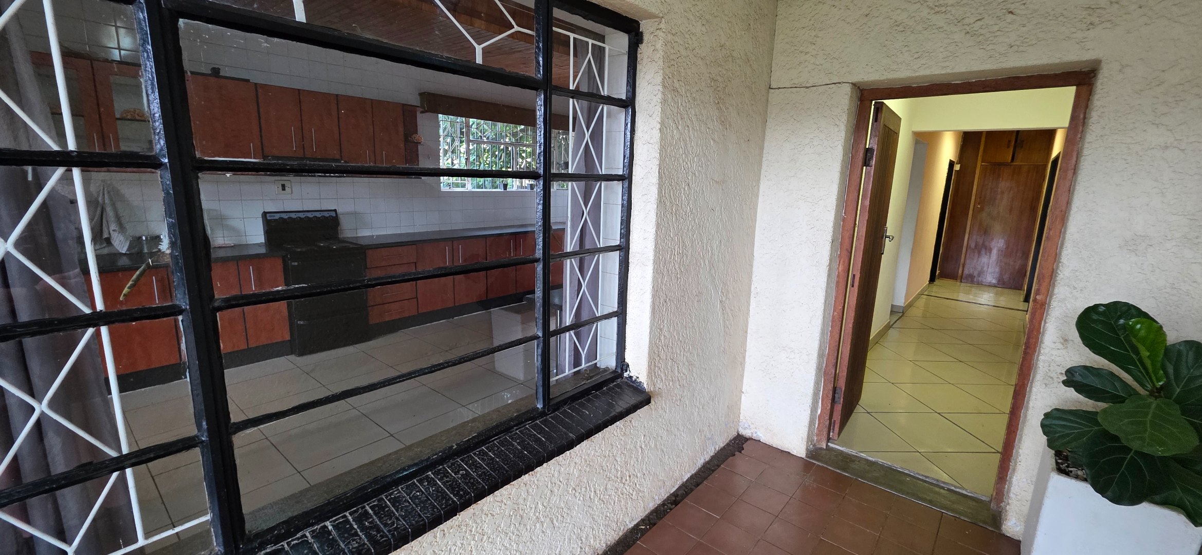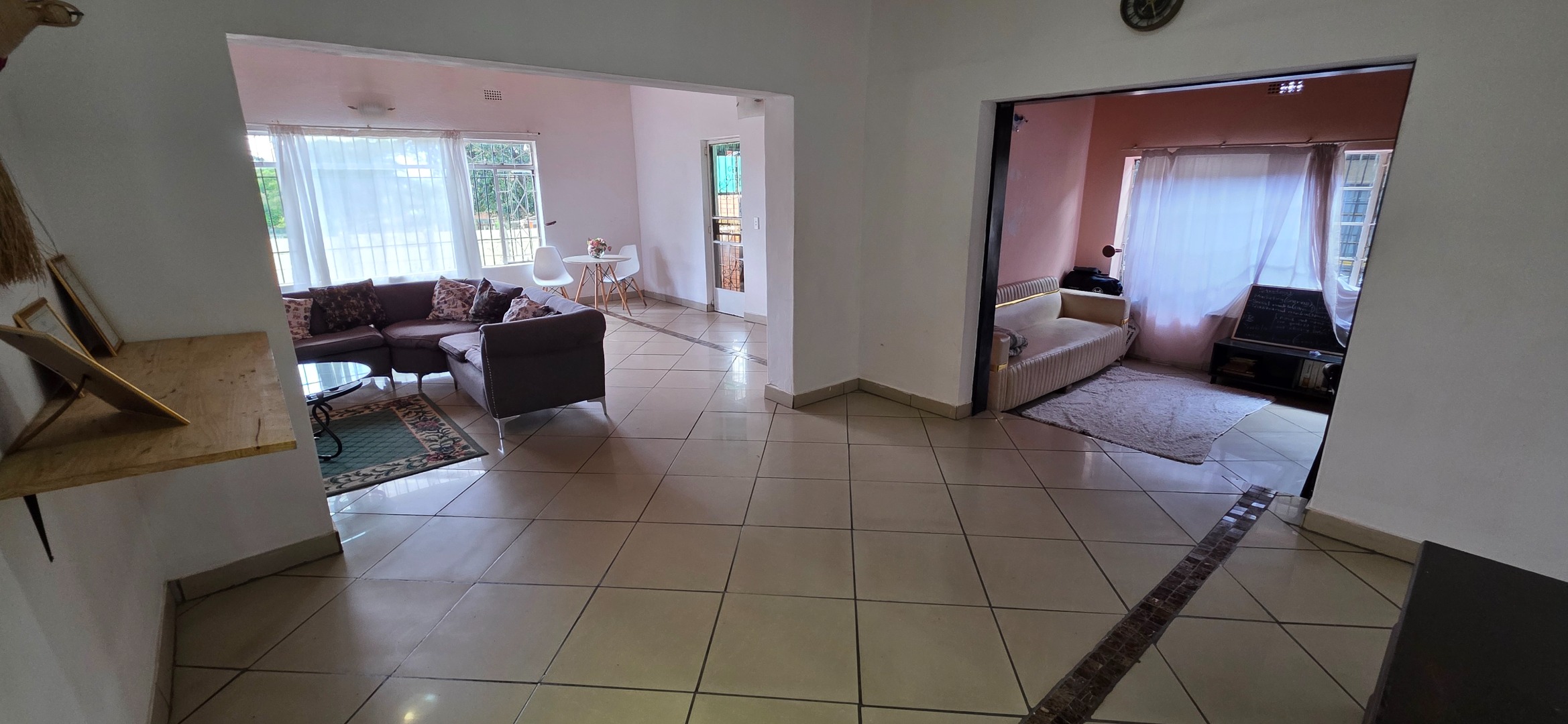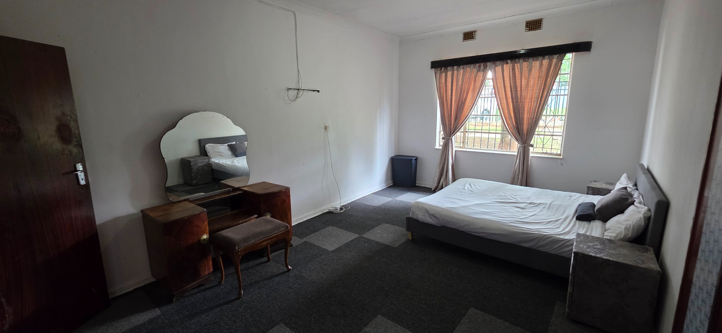 The main house offers three bedrooms. Two of the bedrooms are exceptionally large and can comfortably accommodate king-size beds, while the third bedroom is smaller and best suited to a queen-size bed. The two larger bedrooms offer enough space to include additional furniture such as a small lounge area, dressing space, or work-from-home setup. All bedrooms enjoy good natural light through large windows fitted with security bars, and built-in cupboards are provided.