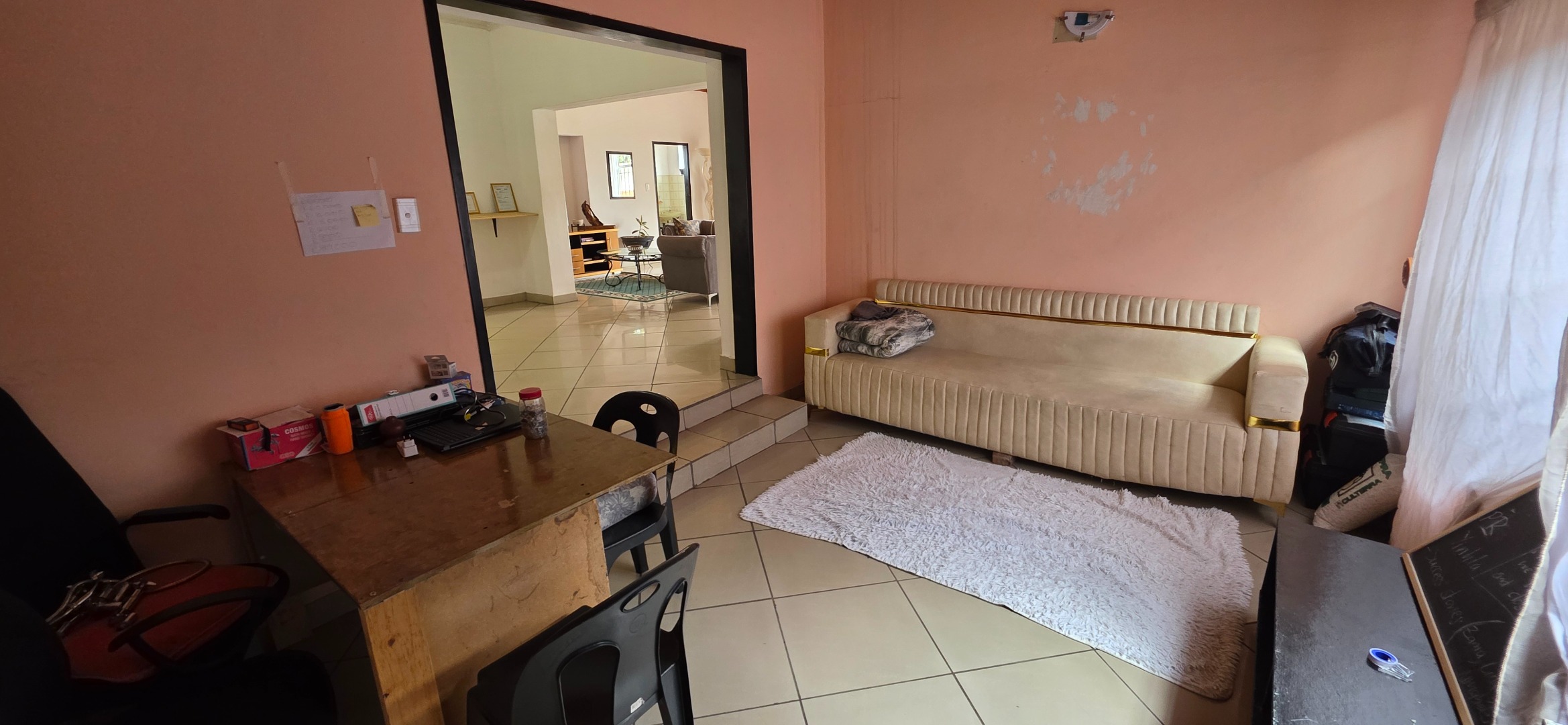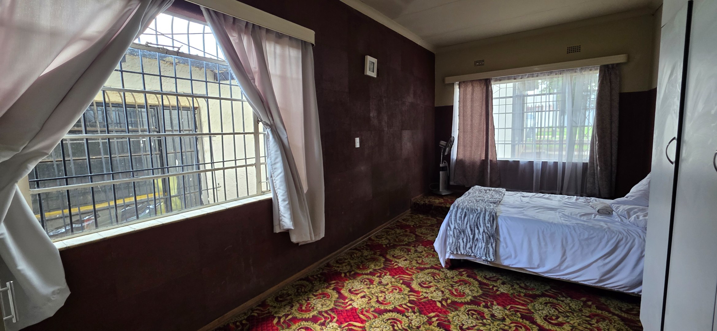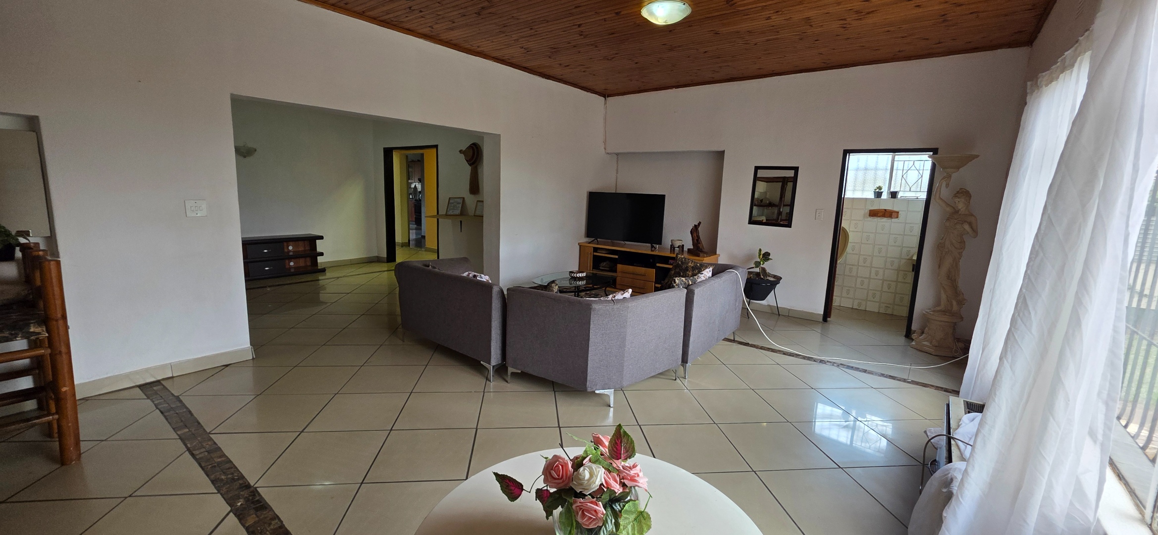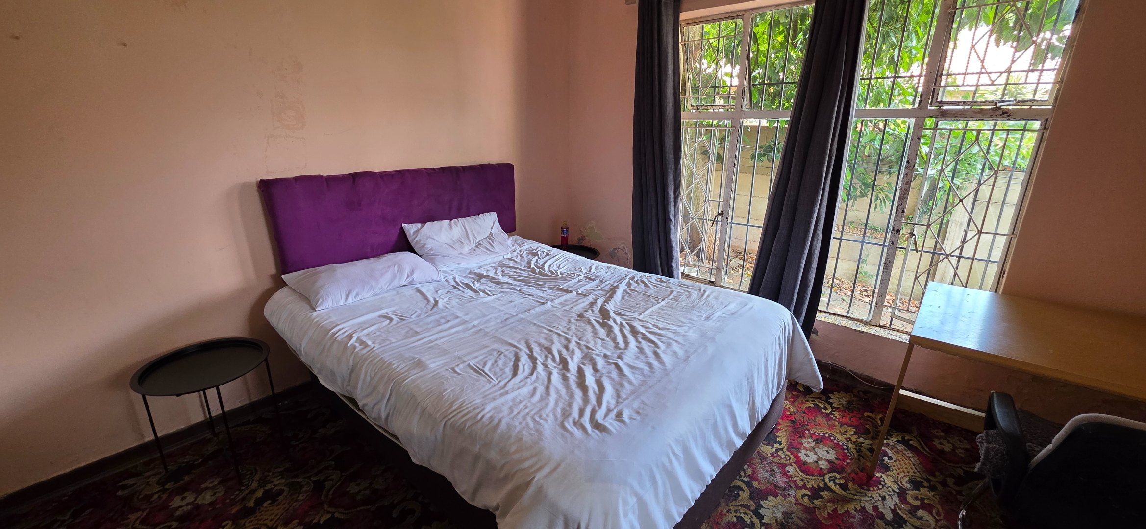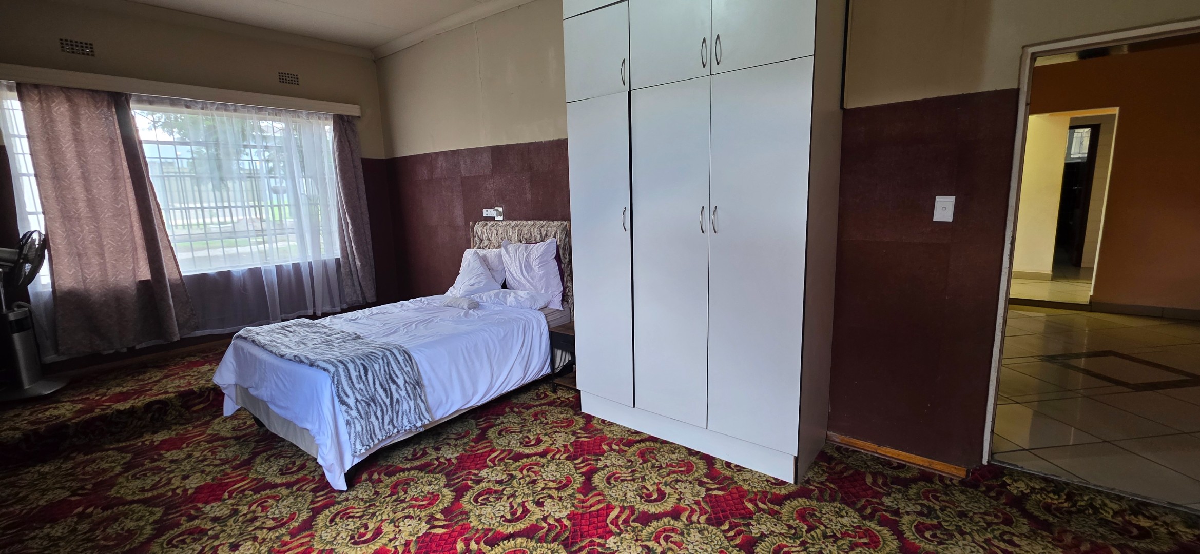 The main house offers three bedrooms. Two of the bedrooms are exceptionally large and can comfortably accommodate king-size beds, while the third bedroom is smaller and best suited to a queen-size bed. The two larger bedrooms offer enough space to include additional furniture such as a small lounge area, dressing space, or work-from-home setup. All bedrooms enjoy good natural light through large windows fitted with security bars, and built-in cupboards are provided.