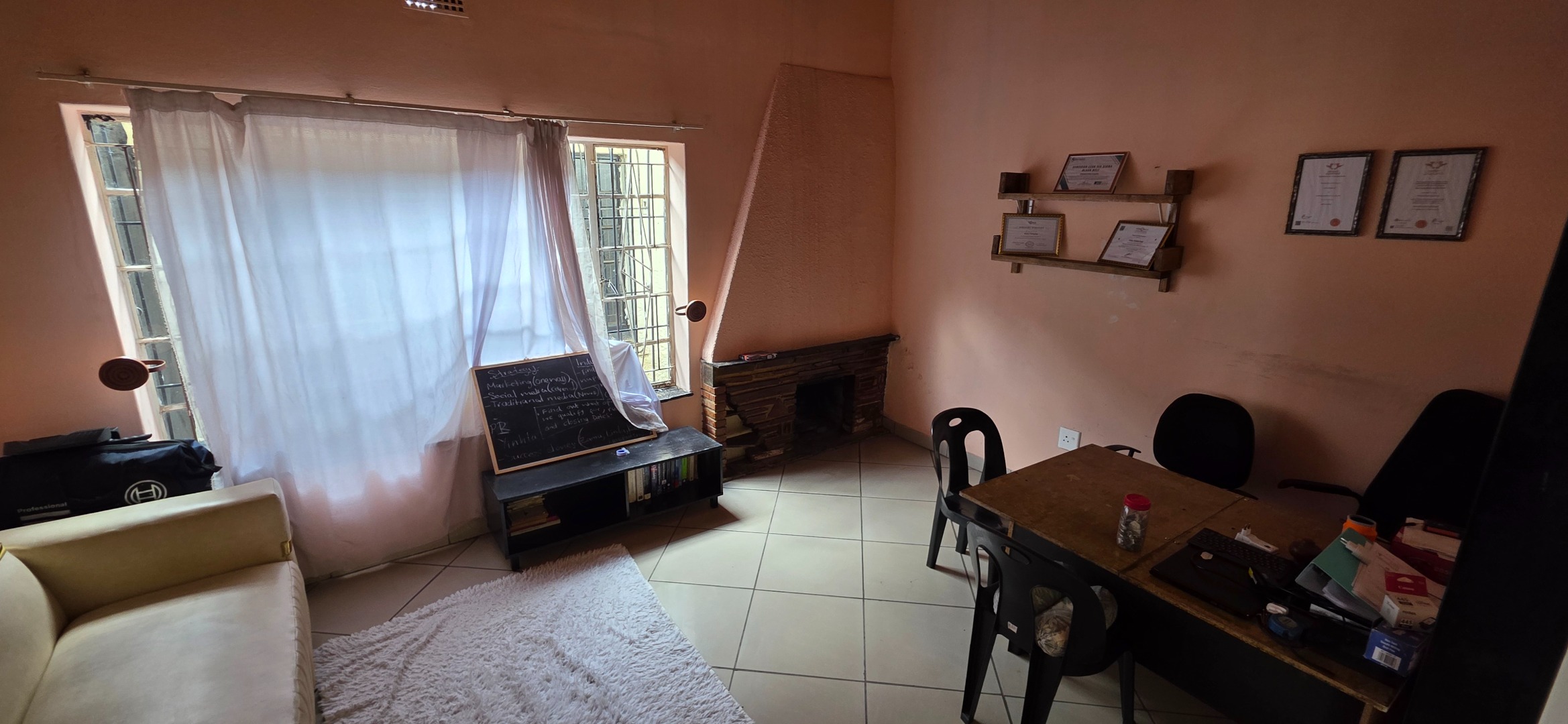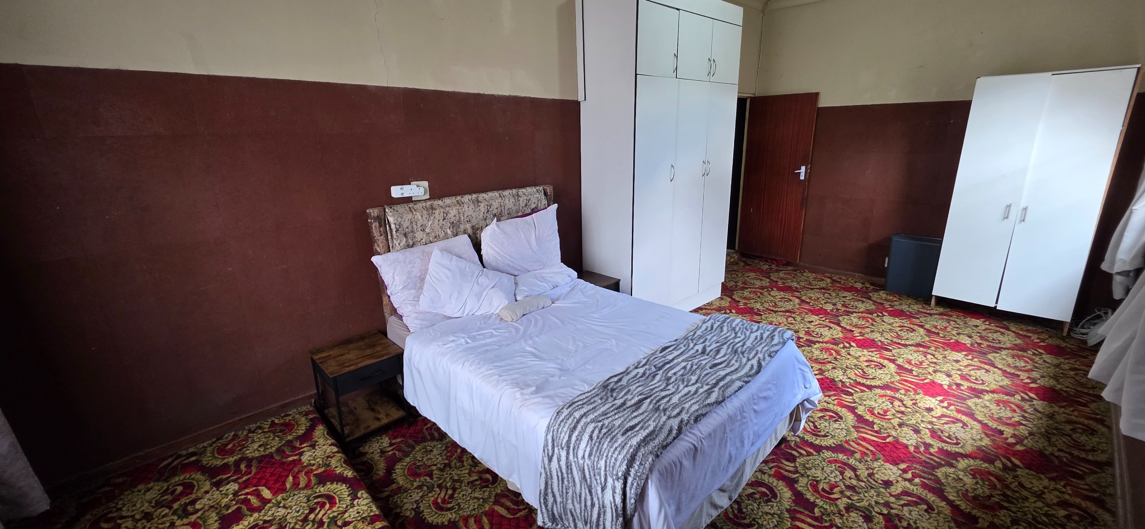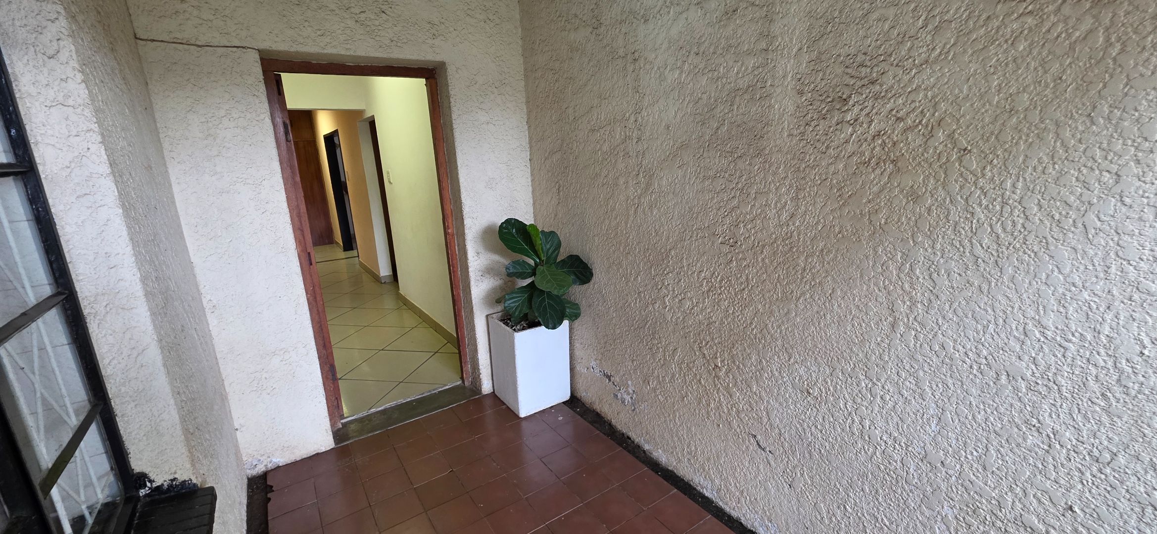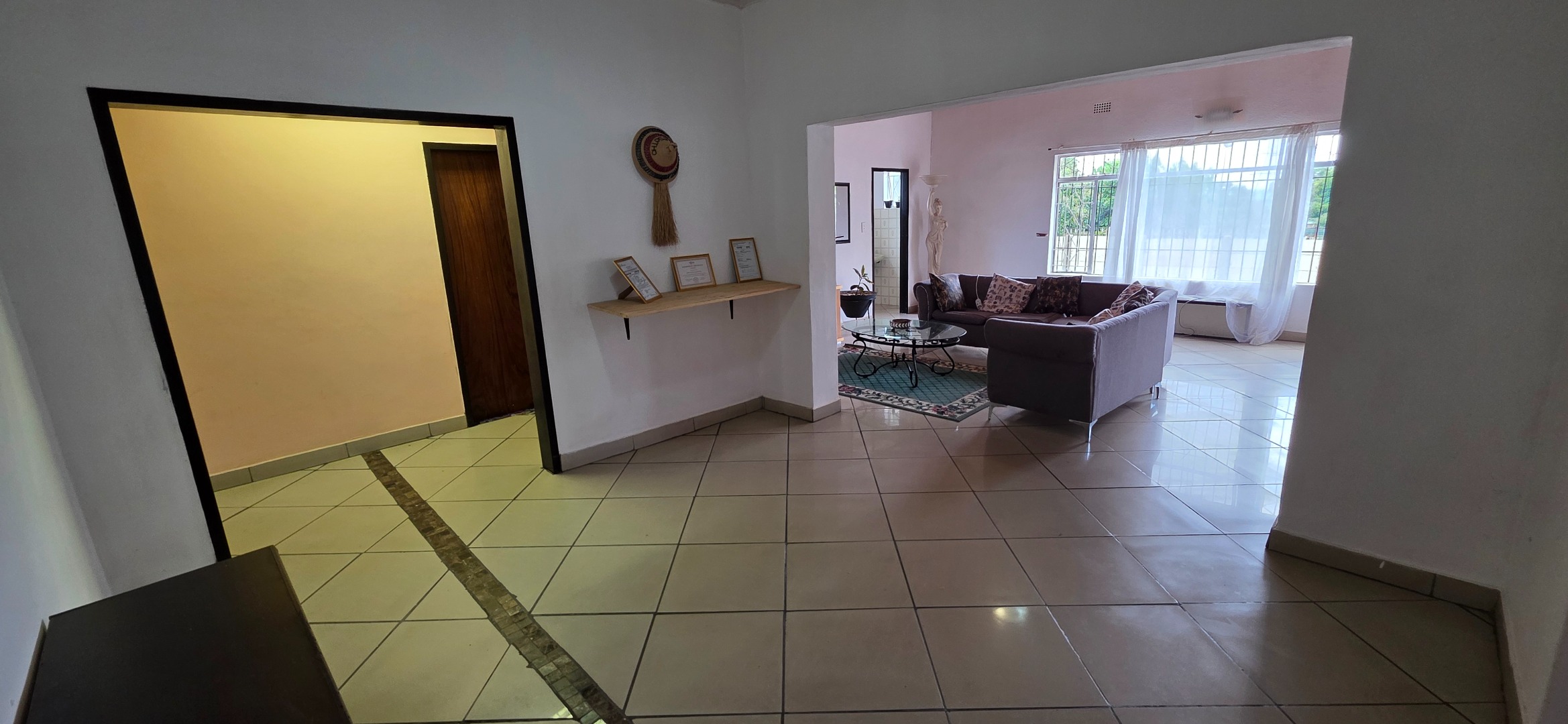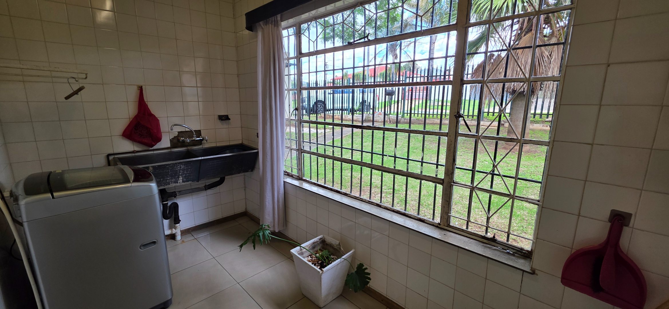 The main house offers three bedrooms. Two of the bedrooms are exceptionally large and can comfortably accommodate king-size beds, while the third bedroom is smaller and best suited to a queen-size bed. The two larger bedrooms offer enough space to include additional furniture such as a small lounge area, dressing space, or work-from-home setup. All bedrooms enjoy good natural light through large windows fitted with security bars, and built-in cupboards are provided.