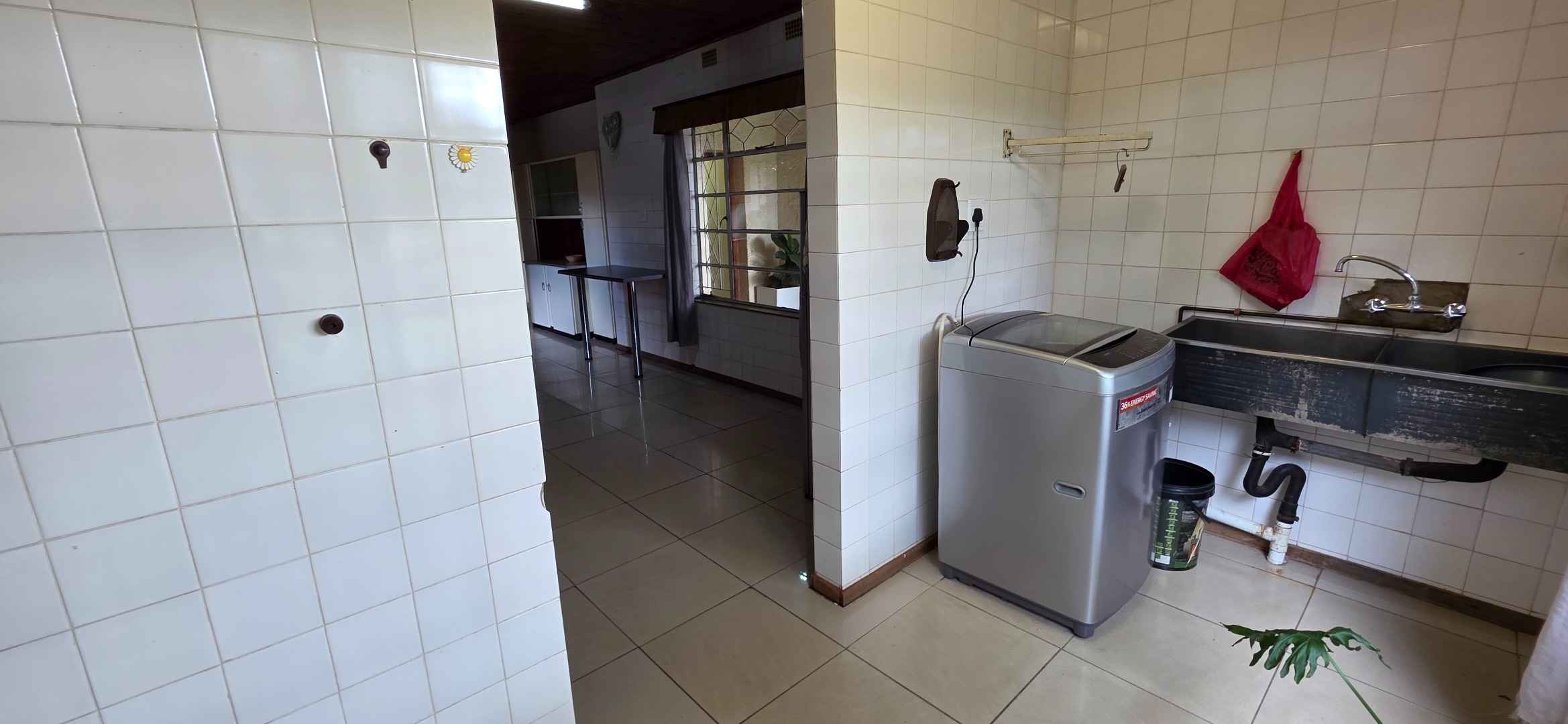 The kitchen is generously sized and practical, offering extensive built-in cupboard space, ample countertops, and room for multiple appliances. There is sufficient space to accommodate a breakfast table or additional preparation surface if desired. The kitchen leads through to a separate scullery and laundry area, which offers space for a washing machine and additional utility storage, keeping the main kitchen neat and uncluttered.