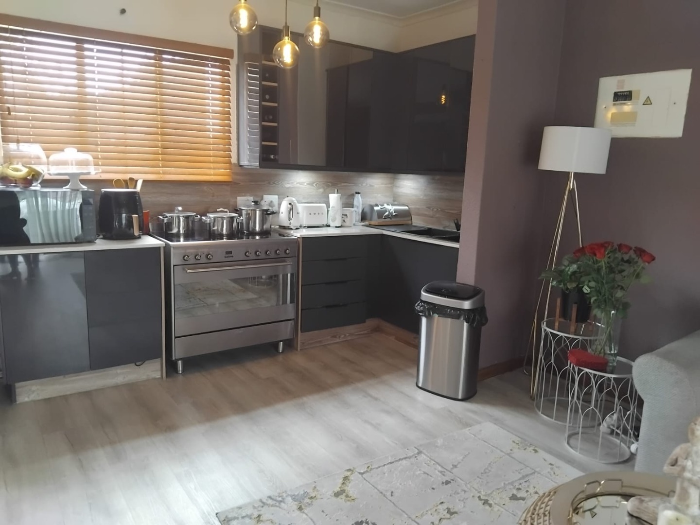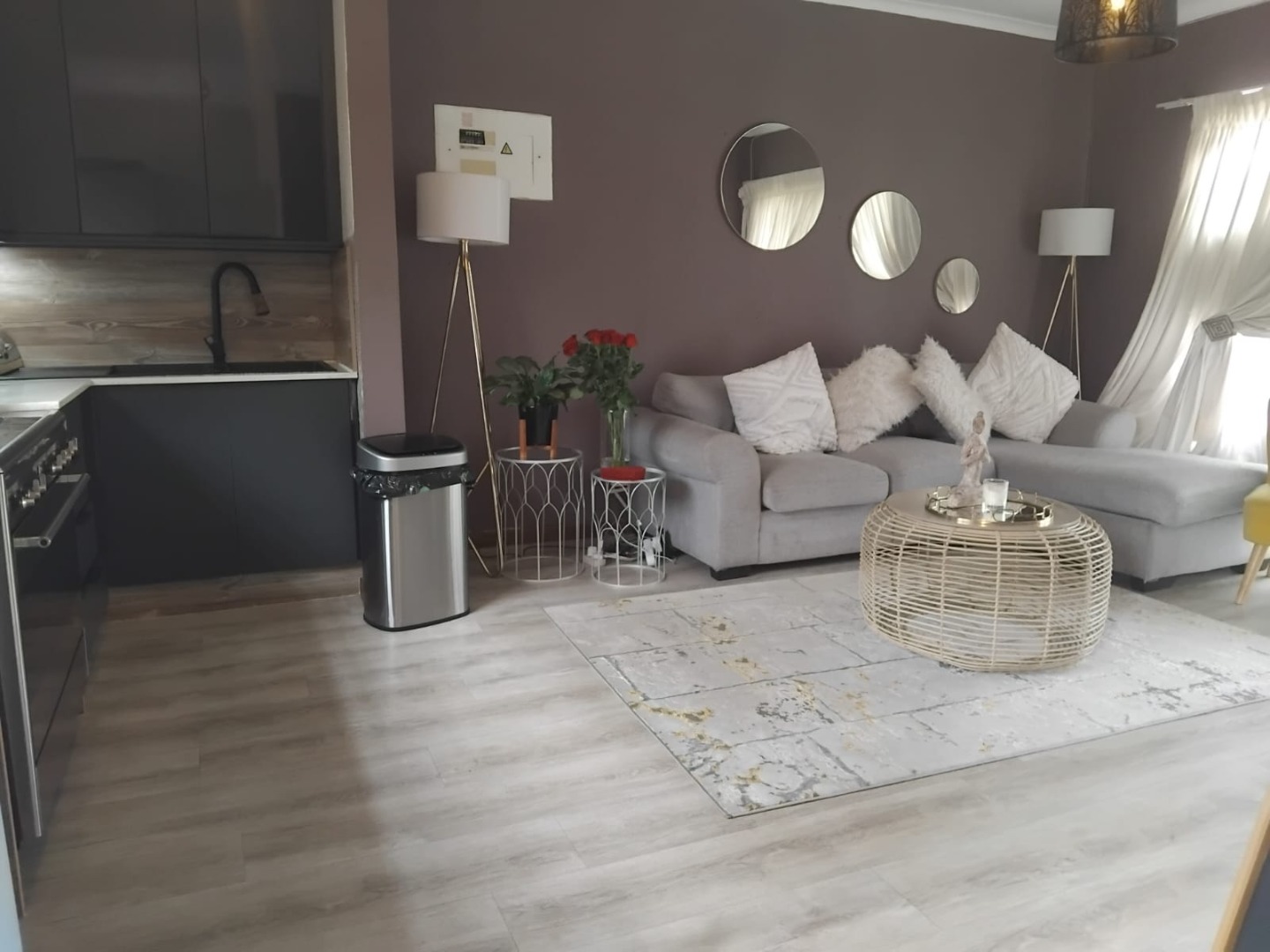 This contemporary 1-bedroom, 1-bathroom apartment offers a sophisticated living experience in the sought-after Willowbrook area of Roodepoort. Designed for modern comfort, the residence features an inviting open-plan layout that seamlessly connects the living spaces. The stylish kitchen is a highlight, boasting sleek dark cabinetry, light countertops, complemented by a chic wood-look backsplash and flooring. This functional space is perfect for daily cooking and entertaining. The adjacent lounge area is bright and airy, benefiting from ample natural light streaming through large windows, creating a welcoming atmosphere for relaxation.