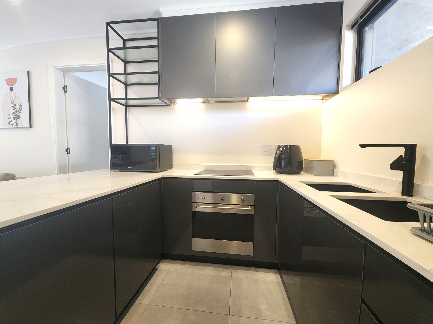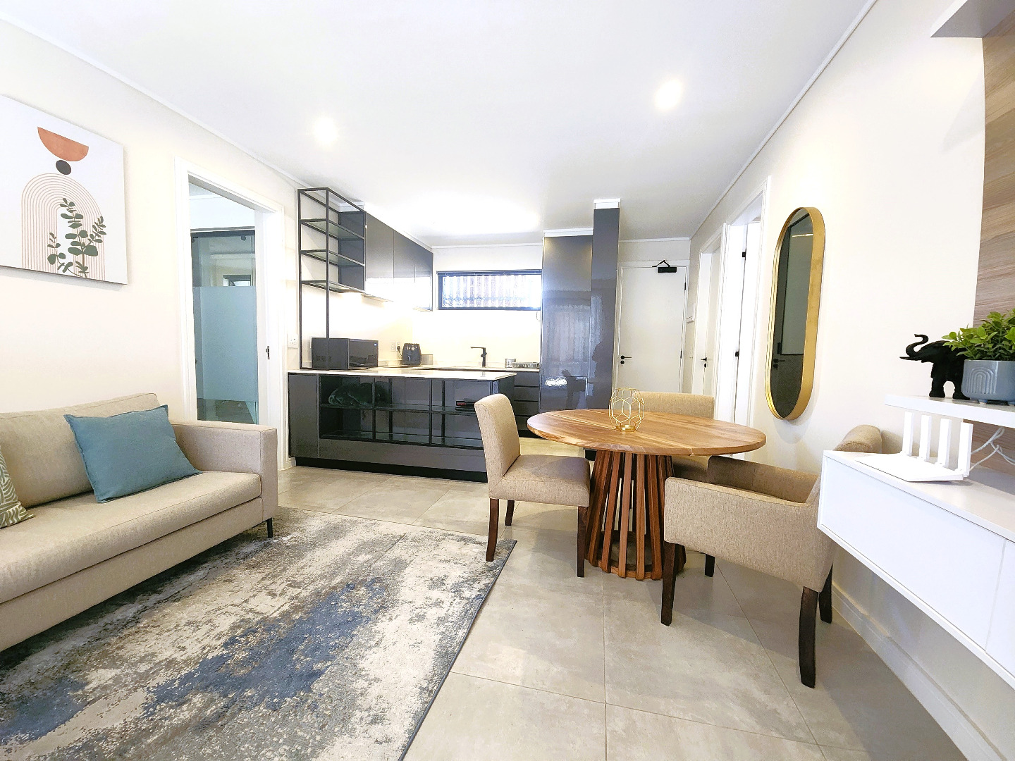 The open-plan kitchen, complete with state-of-the-art appliances, seamlessly flows into the inviting living and dining area, creating an ideal space for entertaining guests or relaxing after a long day.