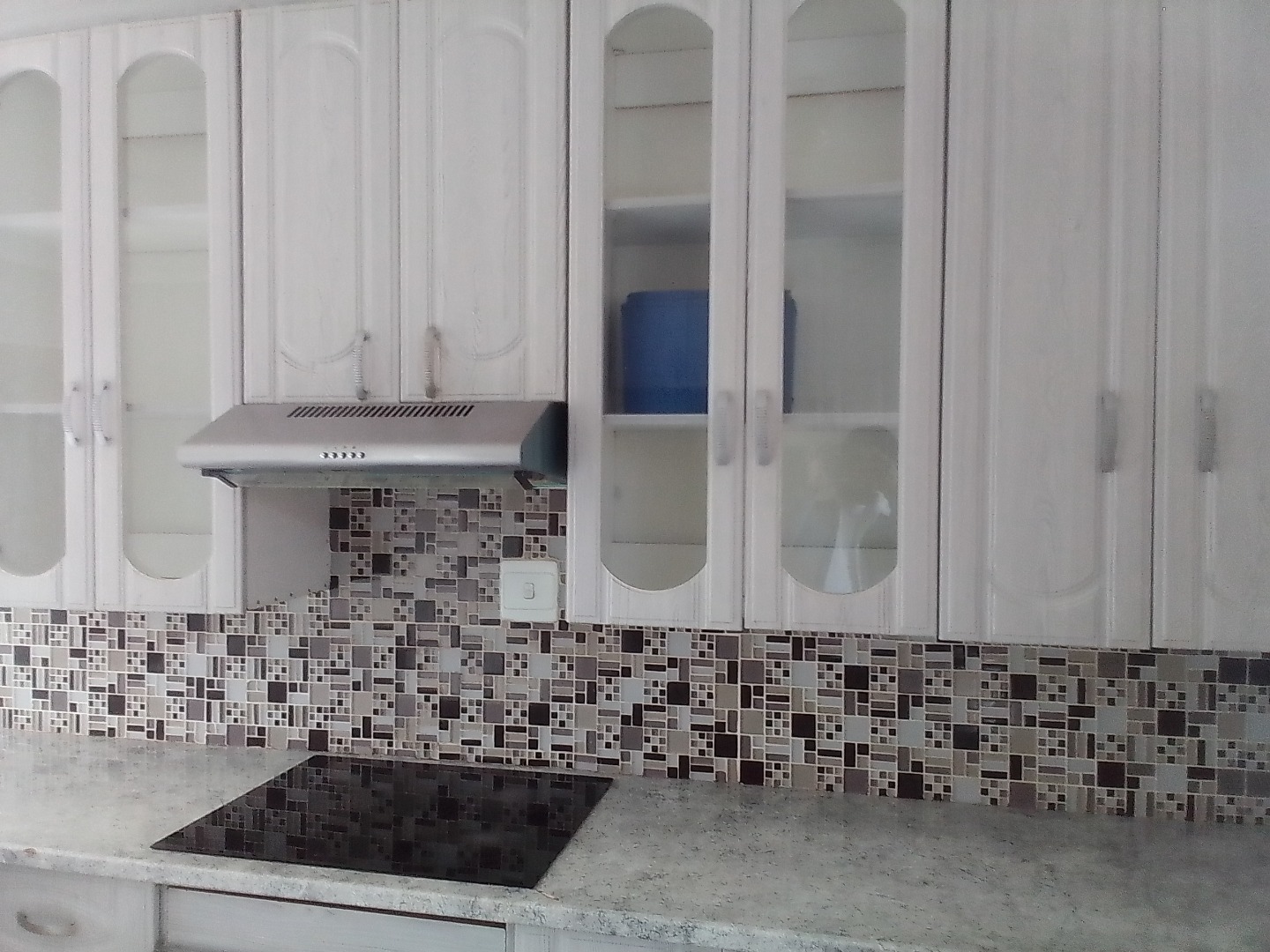 The functional kitchen is equipped with white upper and lower cabinetry, a modern mosaic tile backsplash, and includes an integrated hob, oven, and a range hood for convenient cooking. A double stainless steel sink and ample counter space, alongside provisions for a large refrigerator, complete this essential area. While presenting an opportunity for a personal touch, the kitchen remains a central hub for daily activities. The property also benefits from tiled flooring throughout and neutral wall colours, offering a clean canvas for tenants.