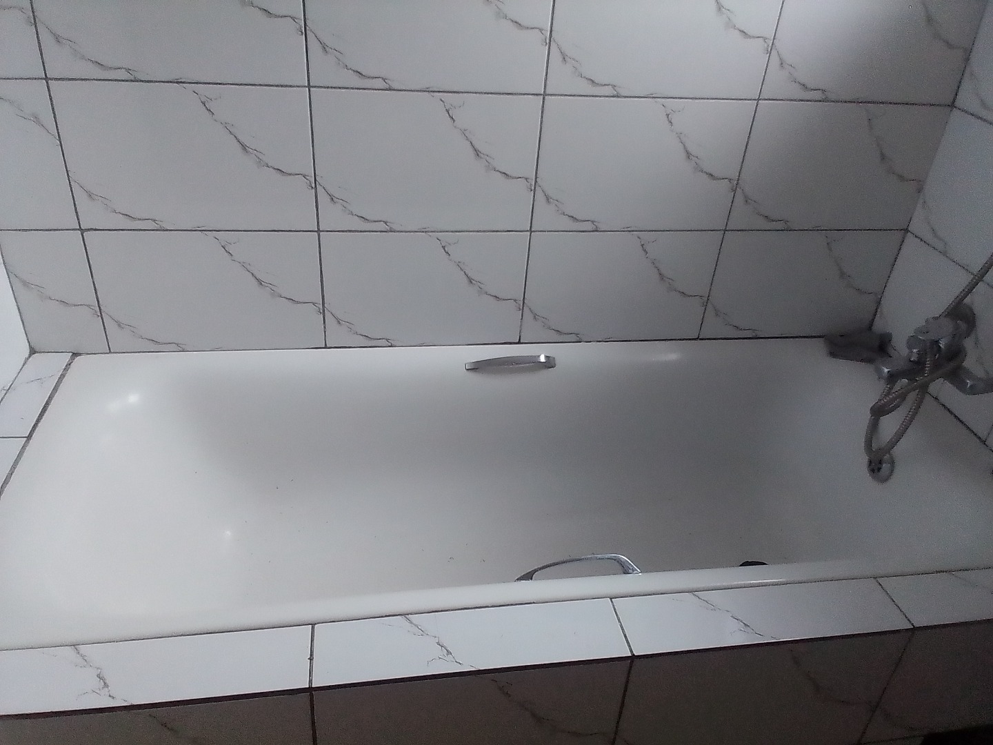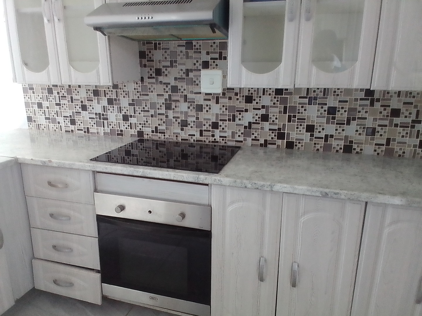 The functional kitchen is equipped with white upper and lower cabinetry, a modern mosaic tile backsplash, and includes an integrated hob, oven, and a range hood for convenient cooking. A double stainless steel sink and ample counter space, alongside provisions for a large refrigerator, complete this essential area. While presenting an opportunity for a personal touch, the kitchen remains a central hub for daily activities. The property also benefits from tiled flooring throughout and neutral wall colours, offering a clean canvas for tenants.